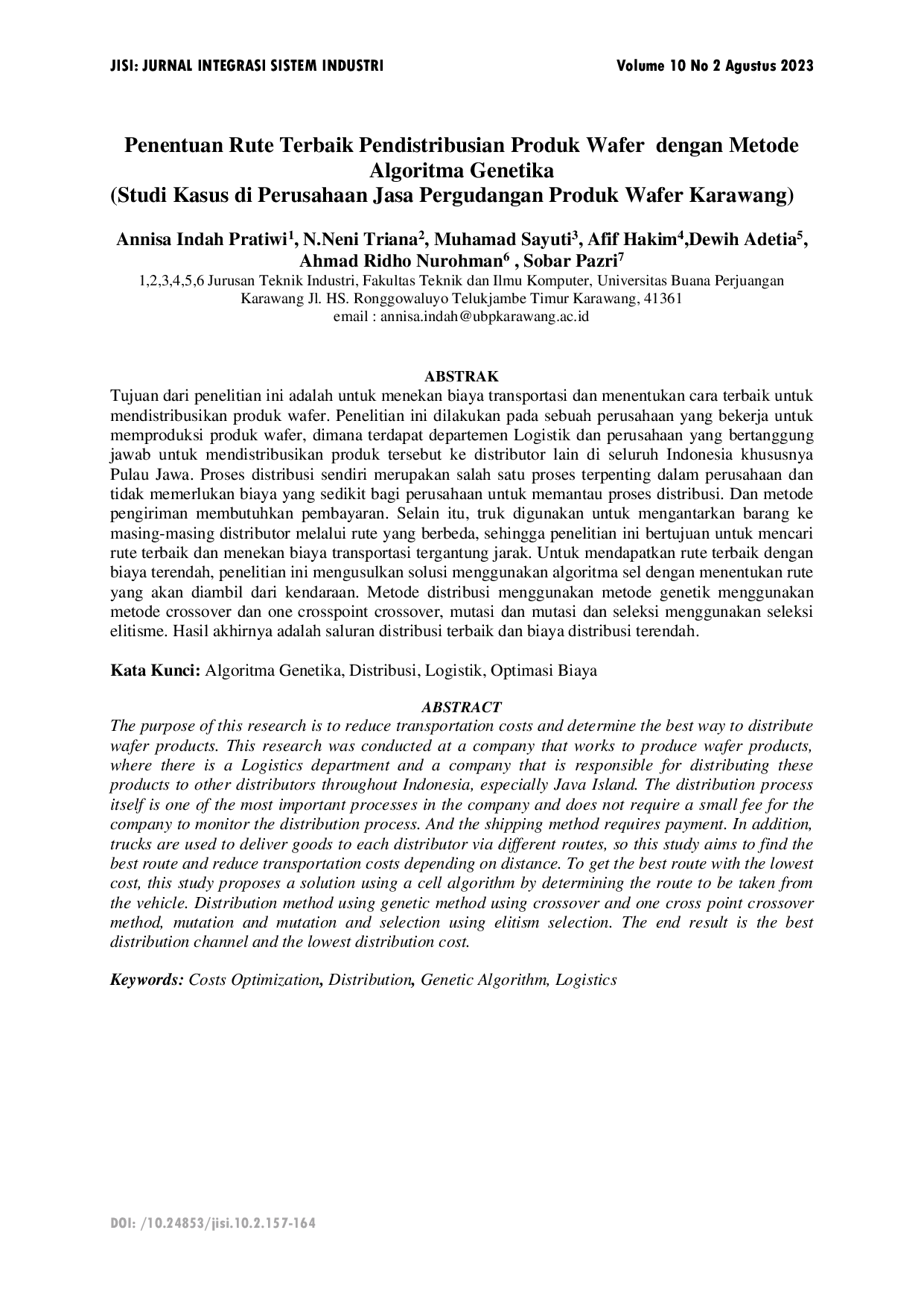 JISI: Jurnal Integrasi Sistem IndustriJISI: Jurnal Integrasi Sistem IndustriTujuan dari penelitian ini adalah untuk menekan biaya transportasi dan menentukan cara terbaik untuk mendistribusikan produk wafer. Penelitian ini dilakukan pada sebuah perusahaan yang bekerja untuk memproduksi produk wafer, dimana terdapat departemen Logistik dan perusahaan yang bertanggung jawab untuk mendistribusikan produk tersebut ke distributor lain di seluruh Indonesia khususnya Pulau Jawa. Proses distribusi sendiri merupakan salah satu proses terpenting dalam perusahaan dan tidak memerlukan biaya yang sedikit bagi perusahaan untuk memantau proses distribusi. Dan metode pengiriman membutuhkan pembayaran. Selain itu, truk digunakan untuk mengantarkan barang ke masing-masing distributor melalui rute yang berbeda, sehingga penelitian ini bertujuan untuk mencari rute terbaik dan menekan biaya transportasi tergantung jarak. Untuk mendapatkan rute terbaik dengan biaya terendah, penelitian ini mengusulkan solusi menggunakan algoritma sel dengan menentukan rute yang akan diambil dari kendaraan. Metode distribusi menggunakan metode genetik menggunakan metode crossover dan one crosspoint crossover, mutasi dan seleksi menggunakan seleksi elitisme. Hasil akhirnya adalah saluran distribusi terbaik dan biaya distribusi terendah.