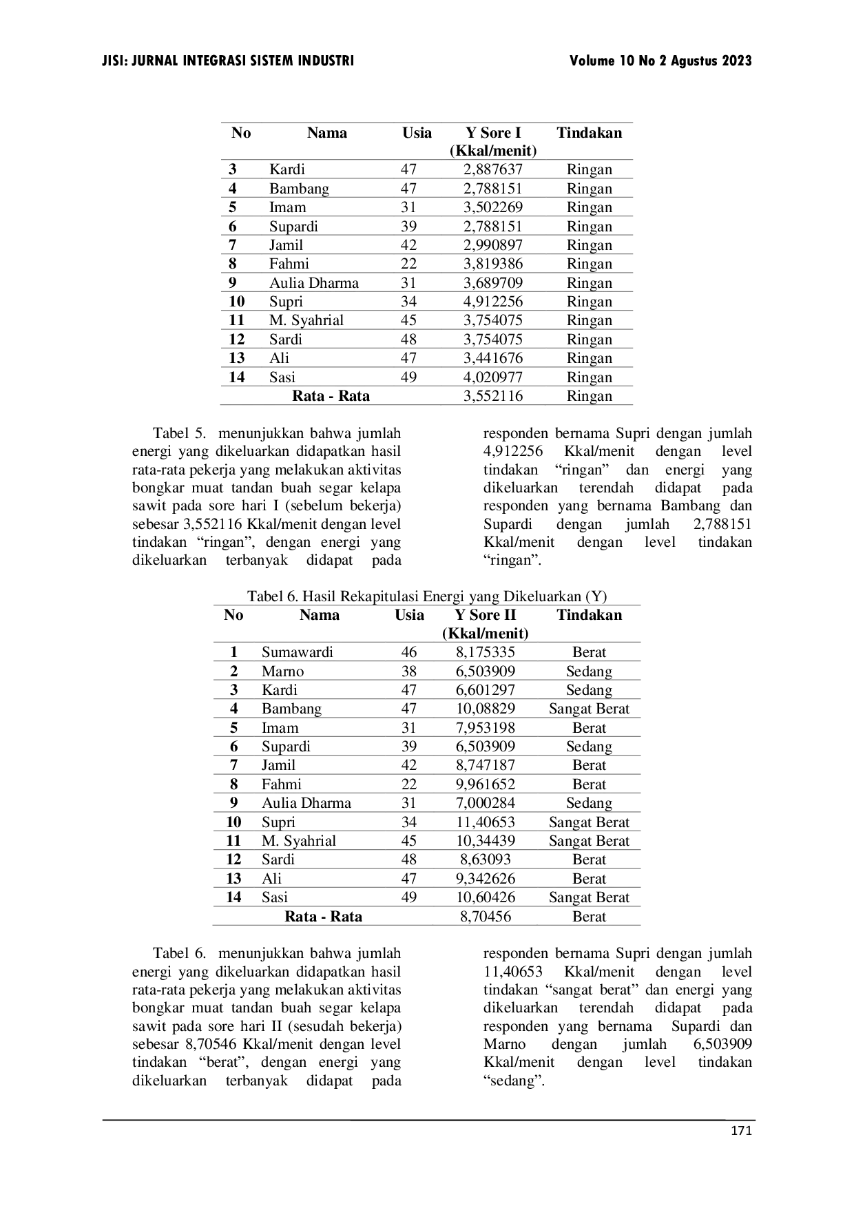 JISI: Jurnal Integrasi Sistem IndustriJISI: Jurnal Integrasi Sistem IndustriPT Perkebunan Nusantara I merupakan perusahaan pengolahan kelapa sawit di Kabupaten Aceh Tamiang. Kendala pada kegiatan ini adalah postur kerja membungkuk dengan menarik beban berat sehingga menimbulkan kelelahan dan resiko kecelakaan kerja. Penelitian bertujuan untuk mengetahui tingkat risiko pekerjaan pekerja bongkar muat ditinjau dari aspek fisiologis dan memberikan saran perbaikan sistem kerja berdasarkan 4 bagian yaitu manusia, metode, peralatan, dan lingkungan. Metode yang digunakan adalah Cardiovascular Load, Energy Consumption, dan Fishbone Diagram. Hasil dan pembahasan, persentase rata-rata %CVL pada pagi dan sore hari adalah 59% (Improvement Required) dan 64,9% (Work in Short Time), serta rata-rata energi yang dikeluarkan pada pagi (sebelum kerja), pagi (sesudah kerja) , siang (sebelum kerja) dan sore (sebelum kerja) adalah 3,703634 Kkal/menit (Ringan), 8,17547 Kkal/menit (Berat), 3,442116 Kkal/menit (Ringan) dan 8,70456 Kkal/menit (Berat) dan diagram tulang ikan menggambarkan penyebab manusia, metode, peralatan dan aspek lingkungan. Kesimpulannya, tingkat kelelahan pekerja berdasarkan rata-rata keseluruhan %CVL dan konsumsi energi sebesar 61,95% (Pekerjaan dalam Waktu Singkat) dan 8,44046 (Berat) Kkal/menit dan usulan perbaikan sistem kerja berupa penyediaan alur waktu kerja, pemberian himbauan, petunjuk, dan pedoman Standar Operasional Prosedur dan Alat Pelindung Diri yang wajib digunakan, pemberian atap di tempat kerja dan penggunaan alat pindahan buah sawit yang disesuaikan dengan postur tubuh pekerja.