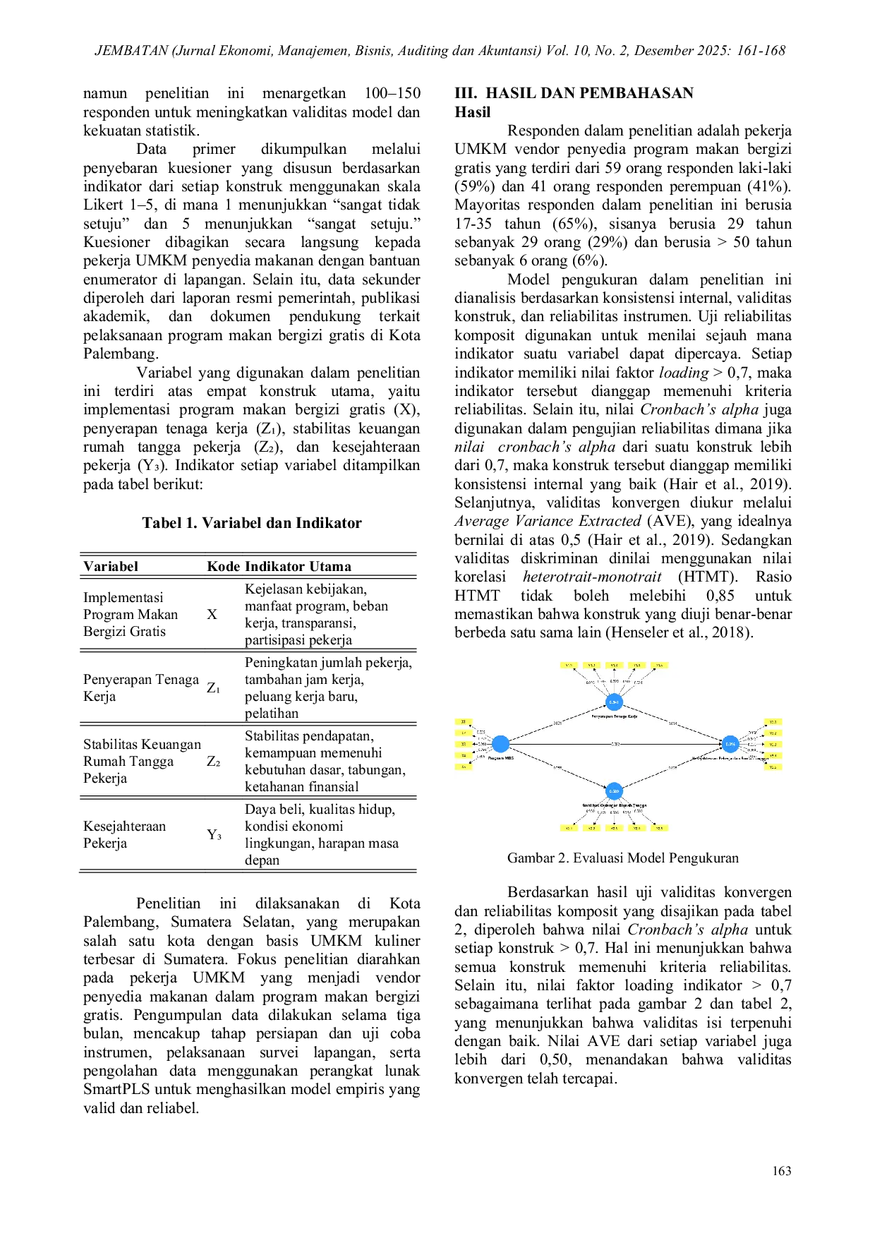 Jurnal Ekonomi, Manajemen, Bisnis, Auditing dan AkuntansiJurnal Ekonomi, Manajemen, Bisnis, Auditing dan AkuntansiPenelitian ini bertujuan untuk menganalisis pengaruh program Makan Bergizi Gratis (MBG) terhadap penyerapan tenaga kerja, stabilitas keuangan rumah tangga, dan kesejahteraan pekerja serta rumah tangga di Kota Palembang. Metode penelitian menggunakan pendekatan kuantitatif dengan teknik survei terhadap pekerja Usaha Mikro kecil Menengah (UMKM) yang menjadi vendor resmi program MBG. Data dianalisis menggunakan Partial Least Squares–Structural Equation Modeling (PLS-SEM) untuk menguji hubungan kausal antarvariabel. Hasil penelitian menunjukkan bahwa program MBG berpengaruh signifikan terhadap penyerapan tenaga kerja dan stabilitas keuangan rumah tangga, namun tidak berpengaruh langsung terhadap kesejahteraan pekerja dan rumah tangga. Temuan penting lainnya menunjukkan bahwa stabilitas keuangan rumah tangga berperan sebagai variabel mediasi yang menjembatani pengaruh program terhadap peningkatan kesejahteraan. Hasil ini menegaskan bahwa kesejahteraan pekerja tidak hanya ditentukan oleh kesempatan kerja, tetapi juga oleh kondisi keuangan rumah tangga yang stabil. Penelitian ini memberikan implikasi bagi pemerintah daerah untuk mengintegrasikan program MBG dengan strategi pemberdayaan ekonomi guna mencapai kesejahteraan masyarakat yang berkelanjutan.