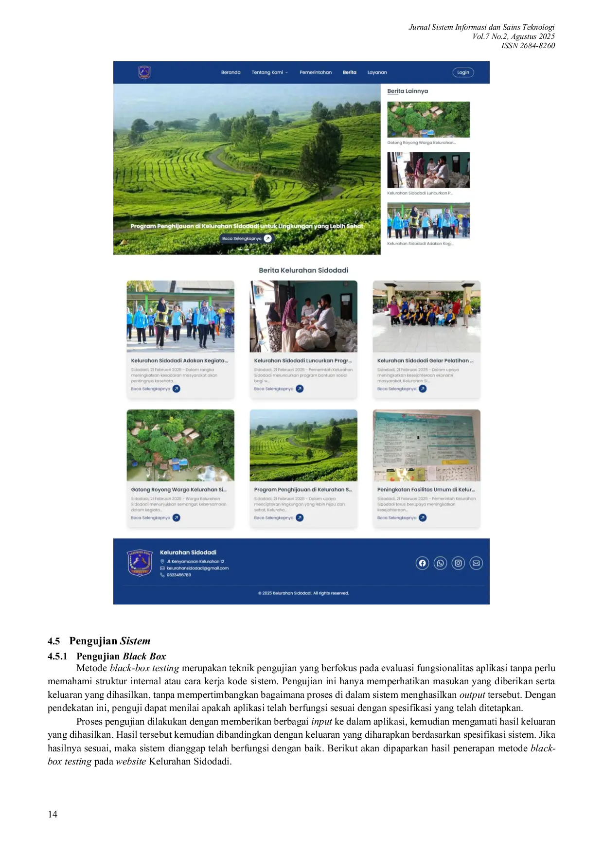 Jurnal Sistem Informasi dan Sains TeknologiJurnal Sistem Informasi dan Sains TeknologiKelurahan Sidodadi di Kabupaten Muna menghadapi tantangan dalam penyebaran informasi dan layanan administrasi yang belum optimal. Penelitian ini bertujuan merancang dan membangun website Kelurahan Sidodadi yang mendukung layanan administrasi dan keterbukaan informasi masyarakat. Metode yang digunakan adalah Design Science Research (DSR), meliputi identifikasi masalah, perancangan solusi, implementasi, dan evaluasi sistem. Hasil penelitian menunjukkan bahwa website yang dikembangkan dengan framework Laravel dan database MySQL menyediakan fitur utama seperti pengajuan surat, informasi kelurahan, dan transparansi data penduduk. Pengujian black-box menunjukkan seluruh fitur berfungsi dengan baik. Evaluasi menggunakan Technology Acceptance Model (TAM) mencatat tingkat kepuasan tinggi, dengan persepsi kemudahan penggunaan sebesar 97% dan manfaat sebesar 94%. Website meningkatkan akses informasi dan efisiensi layanan administrasi masyarakat.