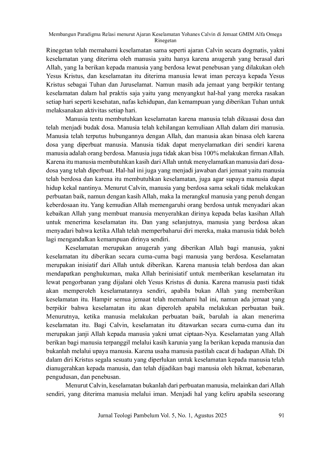 Jurnal Teologi PambelumJurnal Teologi PambelumPenelitian ini membahas tentang membangun paradigma relasi menurut ajaran Yohanes Calvin tentang Keselamatan di Jemaat GMIM Alfa Omega Rinegetan Wilayah Tondano Dua untuk menjawab permasalahan dalam jemaat yang keliru dalam memahami akan konsep berelasi sebagai jemaat. Maka tujuan dari penelitian ini yaitu supaya anggota jemaat dapat memahami bagaimana jemaat berelasi dengan sesama menurut ajaran keselamatan Yohanes Calvin. Dari masalah ini peneliti menggunakan metode penelitian kualitatif, dan peneliti melakukan observasi, wawancara, kemudian memakai teknik sampling dan teknik analisis data untuk mencapai tujuan dari penelitian ini. Dari hasil penelitian ini ditemukan bahwa sebagian jemaat memahami bahwa dalam menjalin relasi dengan orang lain maka apa yang dilakukan orang lain, itu juga yang akan dilakukan kembali kepada orang tersebut, dalam hal positif ataupun negatif.