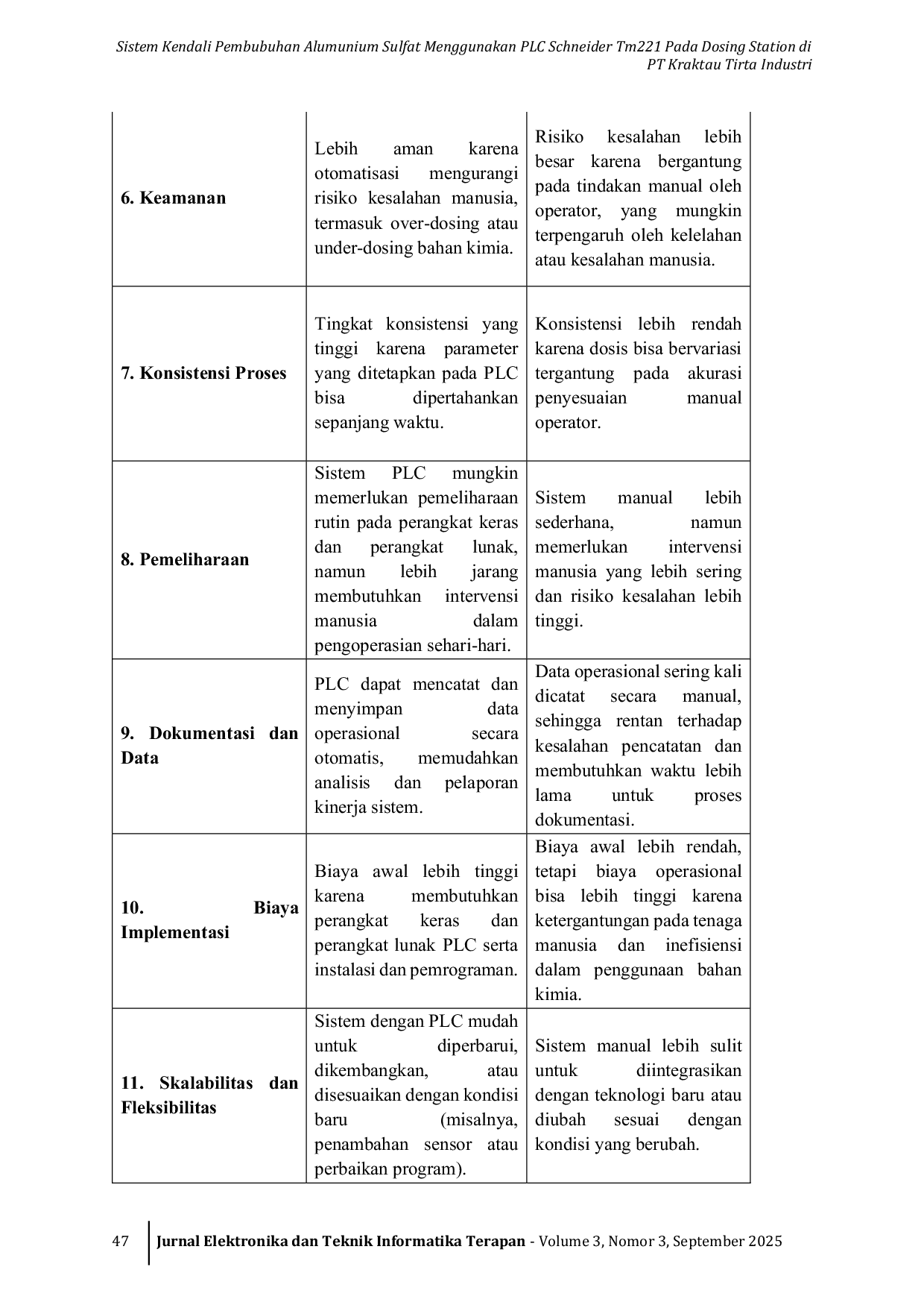 Jurnal Elektronika dan Teknik Informatika Terapan ( JENTIK )Jurnal Elektronika dan Teknik Informatika Terapan ( JENTIK )Sistem kendali pembubuhan aluminium sulfat (alum) merupakan aspek penting dalam proses pengolahan air di PT Krakatau Tirta Industri. Penelitian ini membahas implementasi Programmable Logic Controller (PLC) Schneider TM221 sebagai sistem kendali pada dosing station untuk mengotomatisasi proses pembubuhan alum secara presisi dan efisien. Tujuan penggunaan PLC ini adalah untuk meningkatkan akurasi dosis, memperbaiki kualitas air, serta meminimalkan pemborosan bahan kimia. Dalam sistem ini, PLC Schneider TM221 digunakan untuk mengatur aliran bahan kimia berdasarkan parameter yang telah ditentukan sebelumnya, seperti tingkat kebutuhan air dan konsentrasi alum yang dibutuhkan. Sistem kendali yang dirancang mencakup integrasi antara sensor aliran, pompa, dan perangkat Human Machine Interface (HMI) untuk memonitor proses secara real-time dan memberikan respons otomatis terhadap perubahan kondisi operasional. Hasil penelitian menunjukkan bahwa penggunaan PLC Schneider TM221 mampu meningkatkan efisiensi proses pembubuhan alum dibandingkan dengan metode manual atau semi-otomatis. Sistem ini juga berhasil mengurangi kesalahan operasional, meningkatkan stabilitas proses, serta memberikan kemampuan diagnostik dan perawatan yang lebih baik. Dengan demikian, penerapan PLC Schneider TM221 pada dosing station di PT Krakatau Tirta Industri berkontribusi signifikan dalam meningkatkan kualitas kontrol proses pengolahan air.