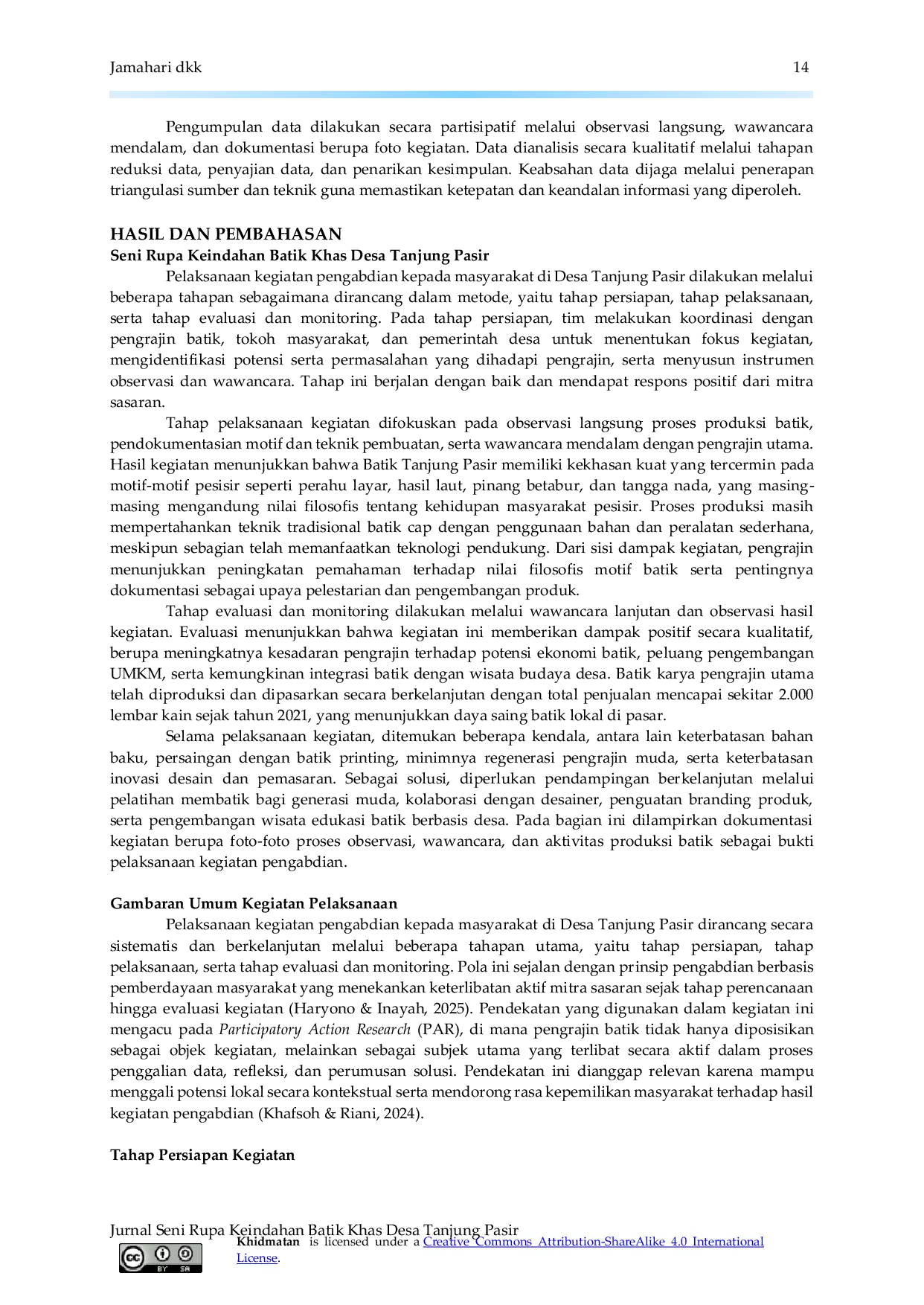 KhidmatanKhidmatanKegiatan pengabdian kepada masyarakat ini bertujuan untuk memperkuat peran pengrajin batik sebagai pelaku ekonomi kreatif dalam upaya pelestarian batik Tanjung Pasir sebagai warisan budaya lokal. Kegiatan dilaksanakan di Desa Tanjung Pasir dengan melibatkan pengrajin batik sebagai mitra utama, serta didukung oleh tokoh masyarakat, pemerintah desa, dan pelaku UMKM setempat. Metode yang digunakan adalah Participatory Action Research (PAR), yang menekankan keterlibatan aktif masyarakat dalam seluruh tahapan kegiatan, mulai dari pemetaan kondisi dan potensi, perencanaan aksi, pelaksanaan pendampingan, hingga evaluasi dan refleksi. Pengumpulan data dilakukan melalui observasi partisipatif, wawancara mendalam, dan dokumentasi kegiatan. Data dianalisis secara kualitatif melalui tahapan reduksi data, penyajian data, dan penarikan kesimpulan. Keabsahan data dijamin melalui triangulasi sumber dan teknik. Hasil kegiatan menunjukkan bahwa pendekatan PAR mampu meningkatkan kesadaran dan partisipasi pengrajin batik dalam melestarikan nilai-nilai budaya lokal yang tercermin dalam proses produksi dan filosofi batik Tanjung Pasir. Kegiatan ini diharapkan dapat memberikan kontribusi nyata dalam penguatan ekonomi kreatif berbasis budaya lokal.