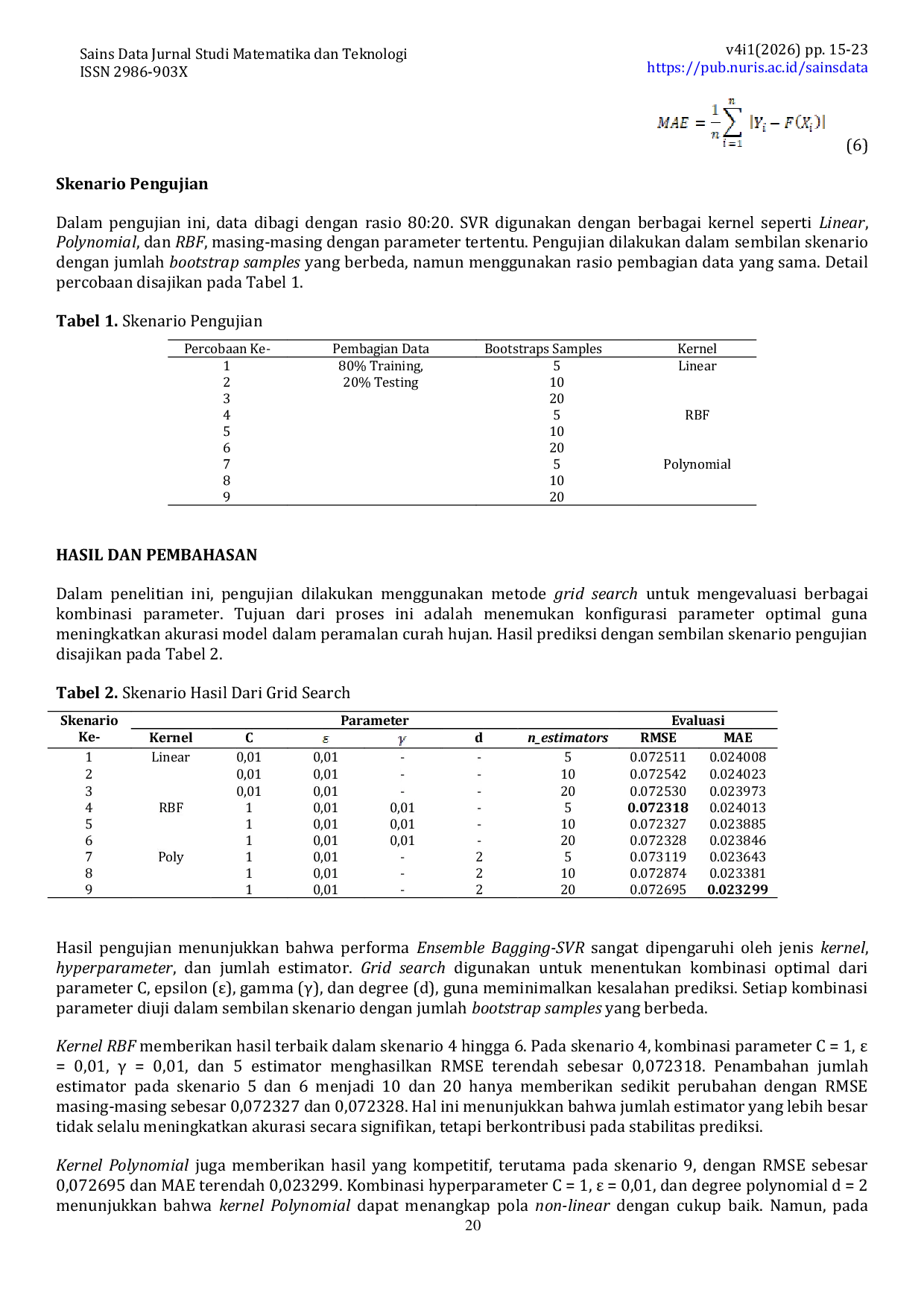 Penelitian ini menunjukkan bahwa metode Support Vector Regression (SVR) dengan pendekatan ensemble bagging memberikan hasil yang baik dalam peramalan curah hujan.Dari sembilan skenario pengujian, performa model sangat dipengaruhi oleh jenis kernel, jumlah estimator, dan kombinasi hyperparameter.Kernel RBF memberikan hasil terbaik pada skenario 4 dengan RMSE sebesar 0,072318 dan MAE sebesar 0,023846, menggunakan kombinasi hyperparameter C = 1, epsilon = 0,01, gamma = 0,01, dan jumlah estimator 5.Sementara itu, kernel Polynomial menunjukkan performa terbaik pada skenario 9 dengan RMSE sebesar 0,072695 dan MAE 0,023299 dengan kombinasi C = 1, epsilon = 0,01, degree = 2, dan jumlah estimator 20.Kernel Linear memiliki performa yang lebih rendah dibandingkan kernel non-linear, dengan hasil terbaik pada skenario 1 (RMSE 0,072511, MAE 0,024008).Meskipun jumlah estimator yang lebih besar dapat meningkatkan stabilitas model, hasil pengujian menunjukkan bahwa peningkatan jumlah estimator dari 5 ke 10 atau 20 tidak selalu memberikan peningkatan akurasi yang signifikan.Selain itu, tuning hyperparameter seperti nilai C, epsilon, gamma, dan degree berperan penting dalam mengoptimalkan performa model.