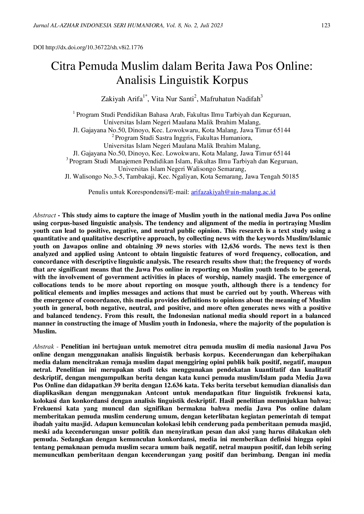 JURNAL Al-AZHAR INDONESIA SERI HUMANIORAJURNAL Al-AZHAR INDONESIA SERI HUMANIORAPenelitian ini bertujuan untuk memotret citra pemuda muslim di media nasional Jawa Pos online dengan menggunakan analisis linguistik berbasis korpus. Kecenderungan dan keberpihakan media dalam mencitrakan remaja muslim dapat menggiring opini publik baik positif, negatif, maupun netral. Penelitian ini merupakan studi teks menggunakan pendekatan kuantitatif dan kualitatif deskriptif, dengan mengumpulkan berita dengan kata kunci pemuda muslim/Islam pada Media Jawa Pos Online dan didapatkan 39 berita dengan 12.636 kata. Teks berita tersebut kemudian dianalisis dan diaplikasikan dengan menggunakan Antcont untuk mendapatkan fitur linguistik frekuensi kata, kolokasi dan konkordansi dengan analisis linguistik deskriptif. Hasil penelitian menunjukkan bahwa; frekuensi kata yang muncul dan signifikan bermakna bahwa media Jawa Pos online dalam memberitakan pemuda muslim cenderung umum, dengan keterlibatan kegiatan pemerintah di tempat ibadah yaitu masjid. Adapun kemunculan kolokasi lebih cenderung pada pemberitaan pemuda masjid, meski ada kecenderungan unsur politik dan menyiratkan pesan dan aksi yang harus dilakukan oleh pemuda. Sedangkan dengan kemunculan konkordansi, media ini memberikan definisi hingga opini tentang pemaknaan pemuda muslim secara umum baik negatif, netral maupun positif, dan lebih sering memunculkan pemberitaan dengan kecenderungan yang positif dan berimbang. Dengan ini media nasional Indonesia selayaknya memberitakan secara berimbang dalam mengkonstruksi citra pemuda muslim di Indonesia, yang mayoritas penduduknya muslim.