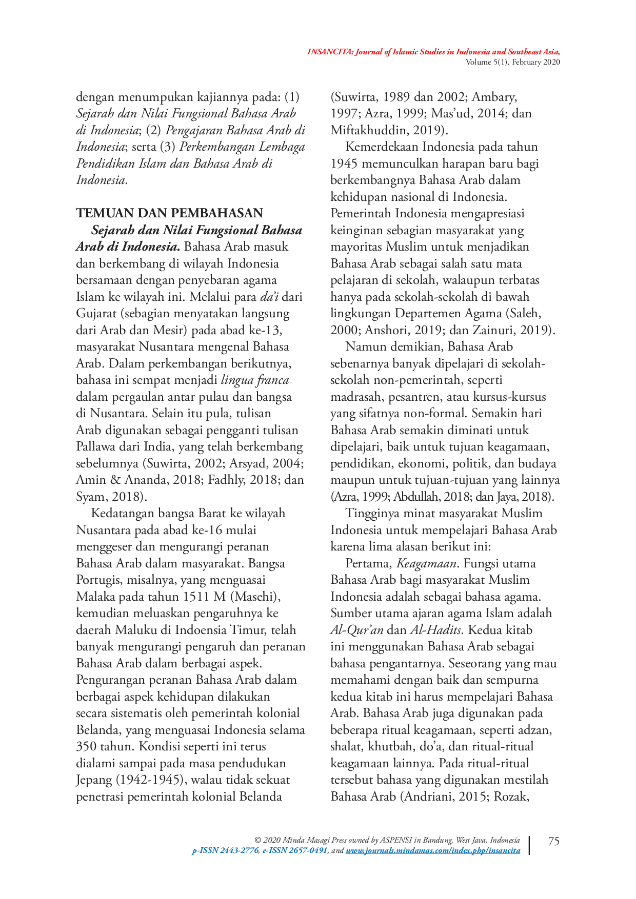 INSANCITAINSANCITAArtikel ini – menggunakan pendekatan kualitatif, studi literatur, dan analisis deskriptif – menunjukkan bahwa bahasa Arab adalah salah satu bahasa tertua yang masih ada sampai sekarang. Ini terjadi karena negara‑negara yang berbahasa Arab secara geografis terletak secara strategis di antara tiga benua: Asia, Eropa, dan Afrika. Selain itu, negara‑negara tersebut memiliki posisi penting dalam ekonomi dunia, karena mereka memasok sebagian besar minyak dunia. Faktor terpenting yang membuat bahasa Arab tetap eksis dan dipelajari oleh sebagian besar orang Indonesia adalah fungsinya sebagai bahasa untuk layanan keagamaan (Islam). Pendakwah dan pedagang dari Gujarat, India, membawa bahasa Arab ke kepulauan Indonesia – beberapa sejarawan mengatakan bahwa mereka langsung dari Arab dan Mesir. Kemudian, tulisan Arab menjadi lingua franca di kepulauan Indonesia/Melayu. Sampai saat ini, bahasa Arab masih sering dipelajari oleh Muslim Indonesia, baik melalui pendidikan formal maupun non‑formal. Dalam pendidikan formal, bahasa Arab dipelajari di Indonesia mulai dari taman kanak‑kanak hingga perguruan tinggi. Sementara di pendidikan non‑formal, bahasa Arab dipelajari di lembaga‑lembaga, seperti Pesantren dan Madrasah. Khusus untuk Pesantren dan Madrasah di Indonesia, ia memiliki sejarah yang sangat panjang, bersama dengan perjuangan bangsa Indonesia. Oleh karena itu, Pesantren dan Madrasah adalah institusi yang menanamkan nilai agama Islam dan menanggapi tantangan masyarakat Indonesia dengan segala dimensinya. Pesantren dan Madrasah juga mengalami dinamika yang berubah, seiring dengan muncul dan berkembangnya ide‑ide pembaharuan Islam di Indonesia.