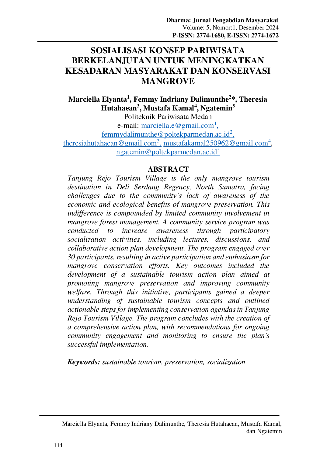 Dharma: Jurnal Pengabdian MasyarakatDharma: Jurnal Pengabdian MasyarakatDesa Wisata Tanjung Rejo adalah satu-satunya desa wisata mangrove yang ada di Kabupaten Deli Serdang, Sumatera Utara, yang menghadapi tantangan akibat minimnya kesadaran masyarakat terhadap manfaat ekonomi dan ekologi dari pelestarian mangrove. Ketidakpedulian ini diperparah dengan terbatasnya keterlibatan masyarakat dalam pengelolaan hutan mangrove. Program pengabdian kepada masyarakat dilakukan untuk meningkatkan kesadaran melalui kegiatan sosialisasi partisipatif, termasuk ceramah, diskusi, dan pengembangan rencana aksi kolaboratif. Program ini melibatkan lebih dari 30 peserta, sehingga menghasilkan partisipasi aktif dan antusiasme terhadap upaya konservasi mangrove. Hasil utama termasuk pengembangan rencana aksi pariwisata berkelanjutan yang bertujuan untuk mempromosikan pelestarian mangrove dan meningkatkan kesejahteraan masyarakat. Melalui inisiatif ini, para peserta memperoleh pemahaman yang lebih dalam tentang konsep pariwisata berkelanjutan dan menguraikan langkah-langkah yang dapat ditindaklanjuti untuk melaksanakan agenda konservasi di Desa Wisata Tanjung Rejo. Program diakhiri dengan pembuatan rencana aksi yang komprehensif, dengan rekomendasi untuk keterlibatan dan pemantauan masyarakat yang berkelanjutan untuk memastikan keberhasilan pelaksanaan rencana.