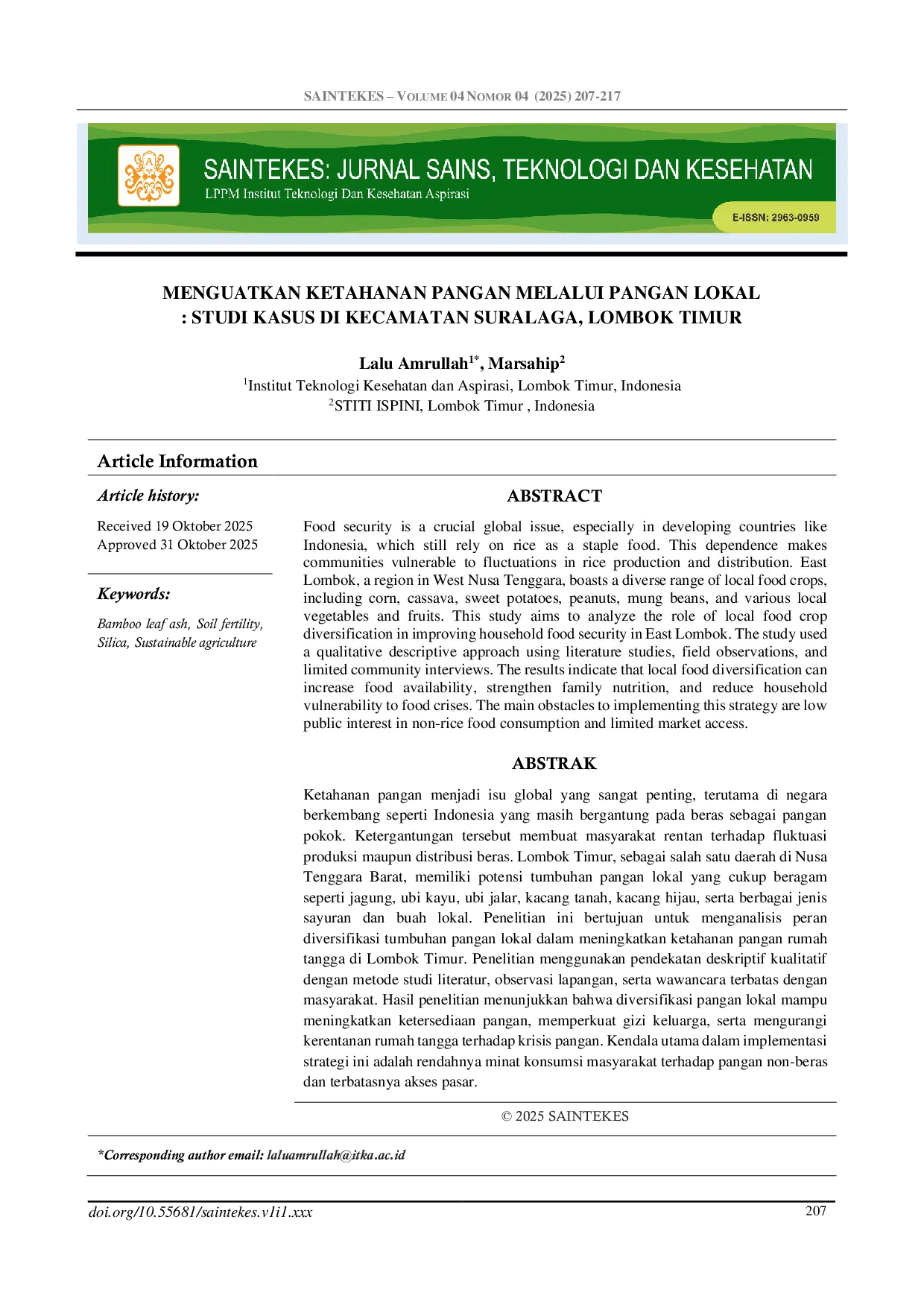 SAINTEKES: Jurnal Sains, Teknologi Dan KesehatanSAINTEKES: Jurnal Sains, Teknologi Dan KesehatanKetahanan pangan menjadi isu global yang sangat penting, terutama di negara berkembang seperti Indonesia yang masih bergantung pada beras sebagai pangan pokok. Ketergantungan tersebut membuat masyarakat rentan terhadap fluktuasi produksi maupun distribusi beras. Lombok Timur, sebagai salah satu daerah di Nusa Tenggara Barat, memiliki potensi tumbuhan pangan lokal yang cukup beragam seperti jagung, ubi kayu, ubi jalar, kacang tanah, kacang hijau, serta berbagai jenis sayuran dan buah lokal. Penelitian ini bertujuan untuk menganalisis peran diversifikasi tumbuhan pangan lokal dalam meningkatkan ketahanan pangan rumah tangga di Lombok Timur. Penelitian menggunakan pendekatan deskriptif kualitatif dengan metode studi literatur, observasi lapangan, serta wawancara terbatas dengan masyarakat. Hasil penelitian menunjukkan bahwa diversifikasi pangan lokal mampu meningkatkan ketersediaan pangan, memperkuat gizi keluarga, serta mengurangi kerentanan rumah tangga terhadap krisis pangan. Kendala utama dalam implementasi strategi ini adalah rendahnya minat konsumsi masyarakat terhadap pangan non-beras dan terbatasnya akses pasar.