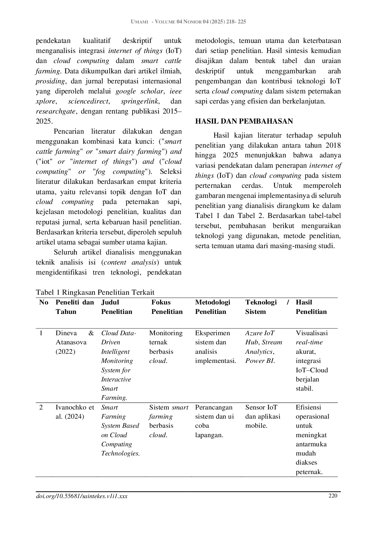 SAINTEKES: Jurnal Sains, Teknologi Dan KesehatanSAINTEKES: Jurnal Sains, Teknologi Dan KesehatanPenelitian ini menyajikan tinjauan literatur mengenai integrasi internet of things (IoT) dan cloud computing dalam peternakan cerdas merupakan langkah penting untuk meningkatkan efisiensi, produktivitas, dan keberlanjutan pengelolaan ternak. Sebanyak sepuluh penelitian yang dipublikasikan antara tahun 2018 hingga 2025 dianalisis untuk mengidentifikasi teknologi IoT yang dominan digunakan, peran cloud dalam pemrosesan data, serta tantangan implementasi di lapangan. Hasil kajian menunjukkan bahwa sensor suhu tubuh, akselerometer, kamera, dan RFID merupakan teknologi IoT yang paling banyak diterapkan dalam pemantauan kondisi fisiologis dan perilaku ternak. Cloud computing berfungsi sebagai infrastruktur utama untuk pemrosesan data real-time, penyimpanan terpusat, visualisasi informasi, dan analitik prediktif. Meskipun menawarkan manfaat signifikan, integrasi IoT–cloud menghadapi sejumlah kendala seperti keterbatasan konektivitas jaringan, interoperabilitas perangkat, skalabilitas, dan keamanan data. Kajian ini menegaskan bahwa IoT dan cloud memiliki potensi besar dalam meningkatkan efisiensi operasional, deteksi dini penyakit, dan kesejahteraan ternak, namun diperlukan penelitian lanjutan untuk mengembangkan arsitektur multisensor yang lebih komprehensif dan sistem yang lebih adaptif terhadap kondisi pedesaan.