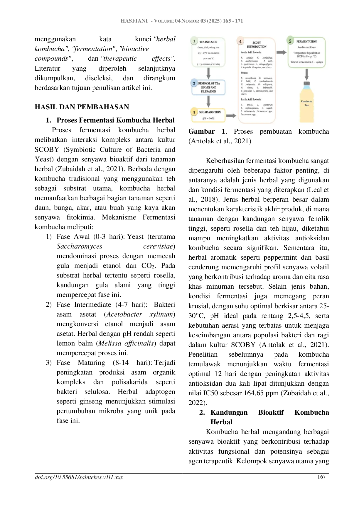 SAINTEKES: Jurnal Sains, Teknologi Dan KesehatanSAINTEKES: Jurnal Sains, Teknologi Dan KesehatanKombucha herbal merupakan minuman fermentasi inovatif yang menggabungkan kultur SCOBY (Symbiotic Culture of Bacteria and Yeast) dengan berbagai ekstrak tanaman herbal, sehingga menghasilkan senyawa bioaktif dengan potensi terapeutik tinggi. Tinjauan ini bertujuan untuk menganalisis proses fermentasi, profil senyawa bioaktif, serta bukti empiris terkait aplikasi kesehatan kombucha herbal. Metode yang digunakan meliputi penelusuran literatur dari database PubMed, ScienceDirect, dan Springer dalam rentang waktu 2010 hingga 2025, dengan kata kunci herbal kombucha, fermentation, bioactive compounds, dan therapeutic effects. Hasil telaah menunjukkan bahwa penambahan herbal seperti jahe, rosella, sambiloto, dan temulawak dapat meningkatkan produksi senyawa antioksidan, seperti polifenol dan flavonoid, serta memperkuat aktivitas antimikroba kombucha. Kombucha herbal menunjukkan potensi yang menjanjikan sebagai agen antikanker, antiinflamasi, antioksidan, dan antimikroba. Dengan manfaat kesehatan yang beragam, kombucha herbal memiliki prospek besar sebagai produk pangan fungsional. Namun demikian, untuk mendukung konsistensi mutu dan efektivitasnya, diperlukan standardisasi proses fermentasi serta uji praklinis dan klinis yang lebih lanjut.
