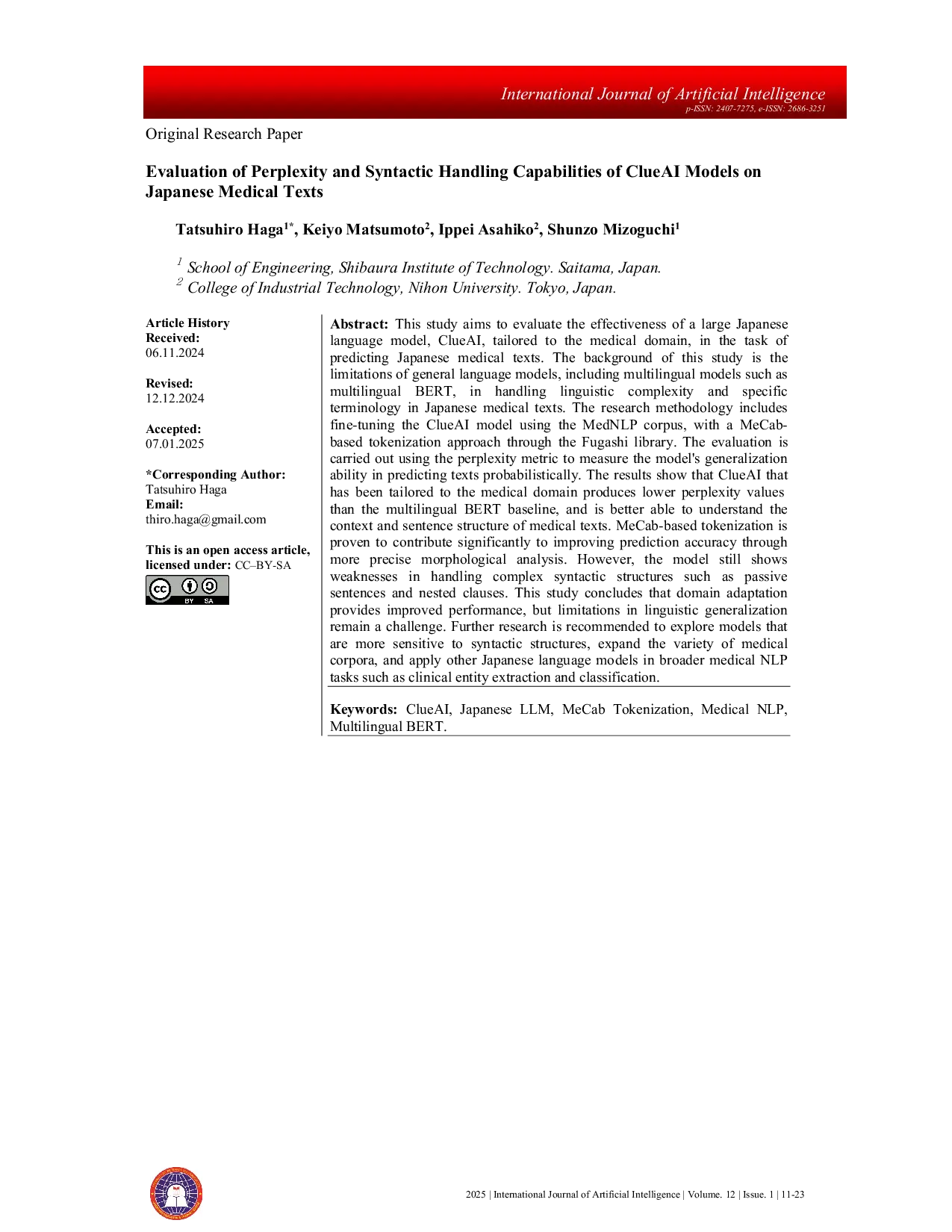 International Journal of Artificial IntelligenceInternational Journal of Artificial IntelligencePenelitian ini bertujuan untuk mengevaluasi efektivitas model bahasa Jepang yang besar, ClueAI, yang disesuaikan dengan domain medis, dalam tugas memprediksi teks medis Jepang. Latar belakang penelitian ini adalah keterbatasan model bahasa umum, termasuk model multilingual seperti multilingual BERT, kompleksitas linguistik, dan terminologi khusus dalam teks medis Jepang. Metode penelitian meliputi penyesuaian ulang model ClueAI menggunakan corpus MedNLP, dengan pendekatan tokenisasi berbasis MeCab melalui perpustakaan Fugashi. Evaluasi dilakukan menggunakan metrik perplexity untuk mengukur kemampuan generalisasi model dalam memprediksi teks secara probabilistik. Hasil menunjukkan bahwa ClueAI yang telah disesuaikan dengan domain medis menghasilkan nilai perplexity lebih rendah daripada baseline multilingual BERT, dan lebih mampu memahami konteks dan struktur kalimat teks medis. Tokenisasi berbasis MeCab terbukti berkontribusi secara signifikan dalam meningkatkan akurasi prediksi melalui analisis morfologis yang lebih presisi. Namun, model masih menunjukkan kelemahan dalam menangani struktur sintaksis yang kompleks seperti kalimat pasif dan klausa bersarang. Penelitian ini menyimpulkan bahwa adaptasi domain memberikan peningkatan kinerja, tetapi keterbatasan dalam generalisasi linguistik tetap menjadi tantangan. Disarankan untuk melakukan penelitian lebih lanjut untuk mengeksplorasi model yang lebih sensitif terhadap struktur sintaksis, memperluas variasi corpus medis, dan menerapkan model bahasa Jepang lainnya dalam tugas NLP medis yang lebih luas seperti ekstraksi entitas klinis dan klasifikasi.