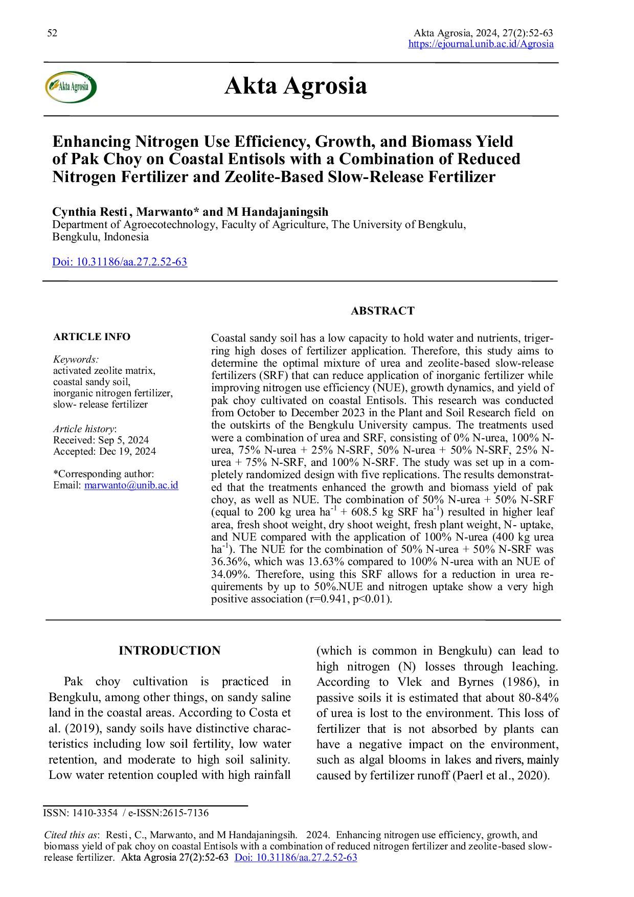 - Enhancing Nitrogen Use Efficiency, Growth, and Biomass Yield of Pak Choy on Coastal Entisols with a Combination... ejournal.unib.ac.id/Agrosia/article/view/36850Enhancing Nitrogen Use Efficiency Growth and Biomass Yield of Pak Choy on Coastal Entisols with a Combination ejournal unib ac Agrosia article view 36850