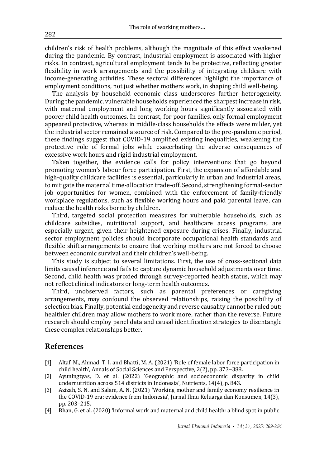 Penelitian menunjukkan bahwa pekerjaan ibu secara umum berhubungan dengan kemungkinan meningkatnya masalah kesehatan anak-anak.Hal ini mengindikasikan bahwa trade-off pengalokasian waktu lebih dominan daripada efek pendapatan dalam konteks Indonesia.Ibu yang bekerja di sektor formal menunjukkan efek pelindung, sementara pekerjaan ibu di bidang industri terkait dengan risiko kesehatan yang lebih tinggi.Penelitian ini mempertahankan pentingnya kebijakan keluarga yang mendukung selama krisis.