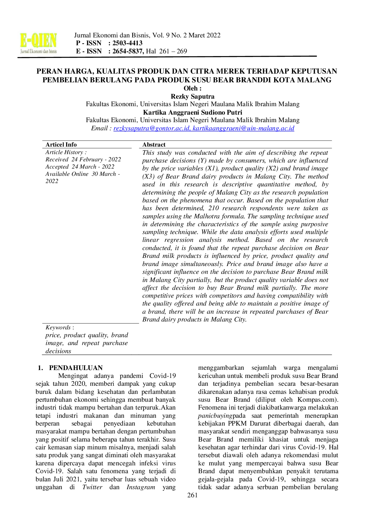Eqien - Jurnal Ekonomi dan BisnisEqien - Jurnal Ekonomi dan BisnisPenelitian ini bertujuan menggambarkan keputusan pembelian berulang (Y) konsumen yang dipengaruhi oleh variabel harga (X1), kualitas produk (X2), dan citra merek (X3) pada produk susu Bear di Kota Malang. Metode yang digunakan adalah kuantitatif deskriptif dengan populasi masyarakat Kota Malang; sampel sebanyak 210 responden dipilih menggunakan rumus Malhotra dan teknik purposive sampling. Analisis data dilakukan dengan regresi linier berganda. Hasil menunjukkan bahwa keputusan pembelian berulang pada produk susu Bear dipengaruhi secara simultan oleh harga, kualitas produk, dan citra merek. Harga dan citra merek juga memberikan pengaruh signifikan secara parsial, sementara variabel kualitas produk tidak berpengaruh signifikan secara parsial. Harga yang kompetitif, kesesuaian kualitas yang ditawarkan, serta citra merek yang positif akan meningkatkan pembelian berulang produk susu Bear di Kota Malang.