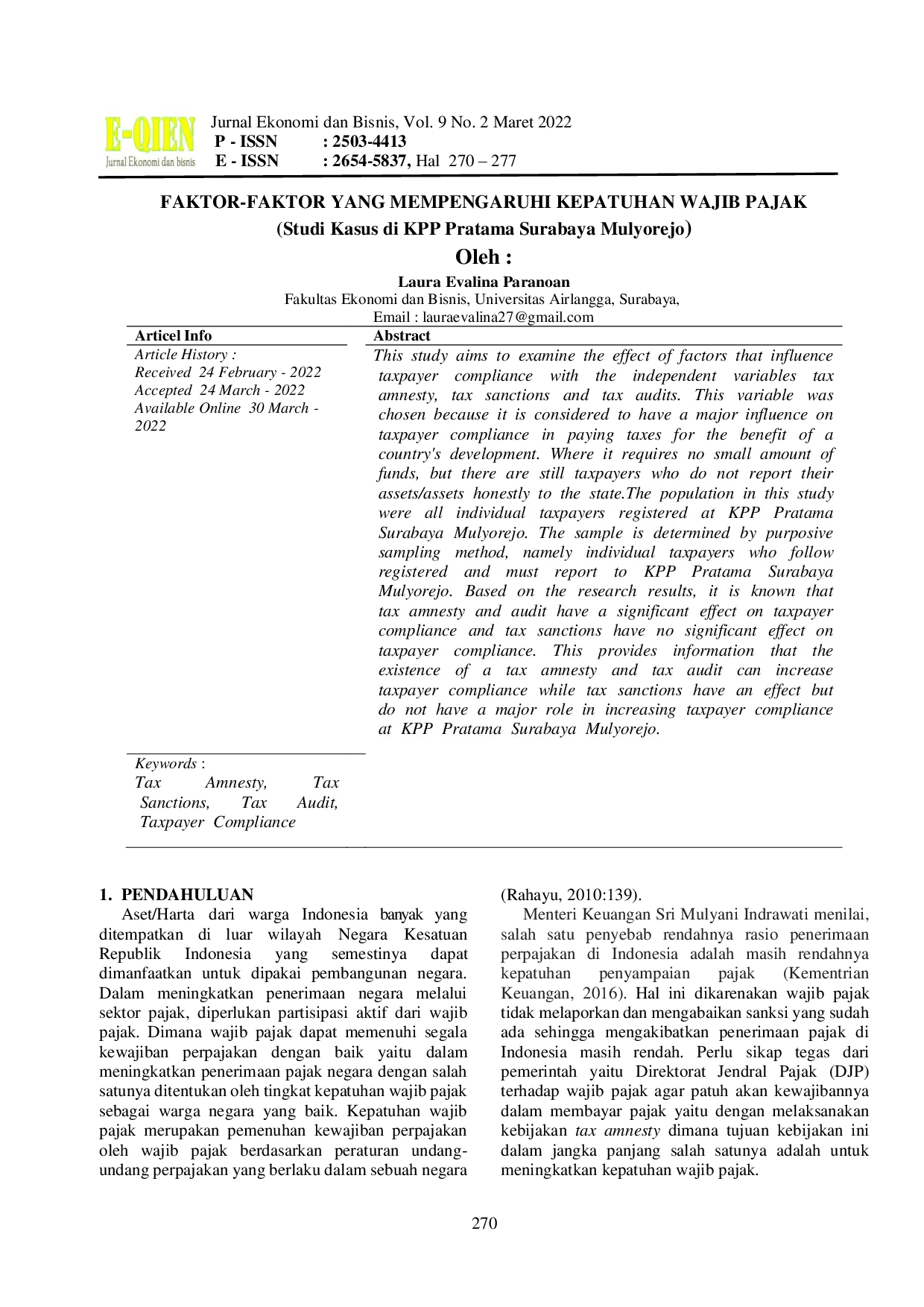 Eqien - Jurnal Ekonomi dan BisnisEqien - Jurnal Ekonomi dan BisnisThis study aims to examine the effect of factors that influence taxpayer compliance with the independent variables tax amnesty, tax sanctions and tax audits. This variable was chosen because it is considered to have a major influence on taxpayer compliance in paying taxes for the benefit of a countrys development. Where it requires no small amount of funds, but there are still taxpayers who do not report their assets/assets honestly to the state. The population in this study were all individual taxpayers registered at KPP Pratama Surabaya Mulyorejo. The sample is determined by purposive sampling method, namely individual taxpayers who follow registered and must report to KPP Pratama Surabaya Mulyorejo. Based on the research results, it is known that tax amnesty and audit have a significant effect on taxpayer compliance and tax sanctions have no significant effect on taxpayer compliance. This provides information that the existence of a tax amnesty and tax audit can increase taxpayer compliance while tax sanctions have an effect but do not have a major role in increasing taxpayer compliance at KPP Pratama Surabaya Mulyorejo.