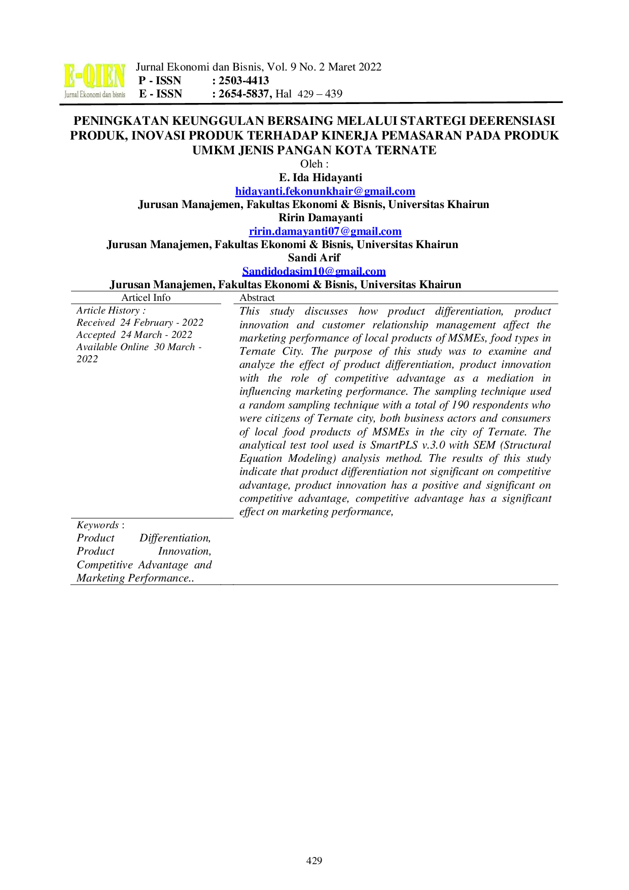 Eqien - Jurnal Ekonomi dan BisnisEqien - Jurnal Ekonomi dan BisnisStudi ini membahas bagaimana diferensiasi produk, inovasi produk, dan manajemen hubungan pelanggan mempengaruhi kinerja pemasaran produk lokal UMKM, jenis makanan di Kota Ternate. Tujuan penelitian ini adalah untuk memeriksa dan menganalisis efek diferensiasi produk, inovasi produk dengan peran keunggulan kompetitif sebagai mediator dalam mempengaruhi kinerja pemasaran. Teknik sampling yang digunakan adalah teknik sampling acak dengan total 190 responden yang merupakan warga Kota Ternate, baik pelaku usaha maupun konsumen produk makanan lokal UMKM di Kota Ternate. Alat uji analitis yang digunakan adalah SmartPLS v.3.0 dengan metode analisis SEM (Structural Equation Modeling). Hasil penelitian ini menunjukkan bahwa diferensiasi produk tidak signifikan terhadap keunggulan kompetitif, inovasi produk memiliki pengaruh positif dan signifikan terhadap keunggulan kompetitif, dan keunggulan kompetitif memiliki pengaruh signifikan terhadap kinerja pemasaran.