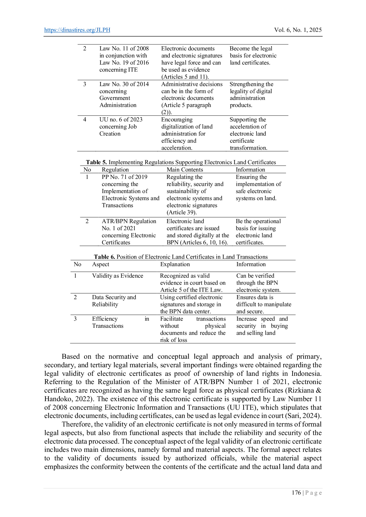 Berdasarkan analisis normatif dan konseptual, dapat disimpulkan bahwa sertifikat elektronik memiliki validitas hukum sebagai bukti kepemilikan hak pertanahan di Indonesia, sebagaimana diatur dalam Peraturan Menteri ATR/BPN Nomor 1 Tahun 2021 dan didukung oleh ketentuan dalam UU ITE.Validitas hukum sertifikat elektronik tidak hanya bergantung pada kerangka normatif, tetapi juga didukung oleh kepercayaan publik, integritas sistem digital, dan perlindungan hukum yang setara dengan sertifikat fisik.Oleh karena itu, penguatan infrastruktur teknologi, literasi digital, dan sistem pemantauan yang andal menjadi kunci keberhasilan implementasi sertifikat elektronik dalam sistem administrasi pertanahan nasional.