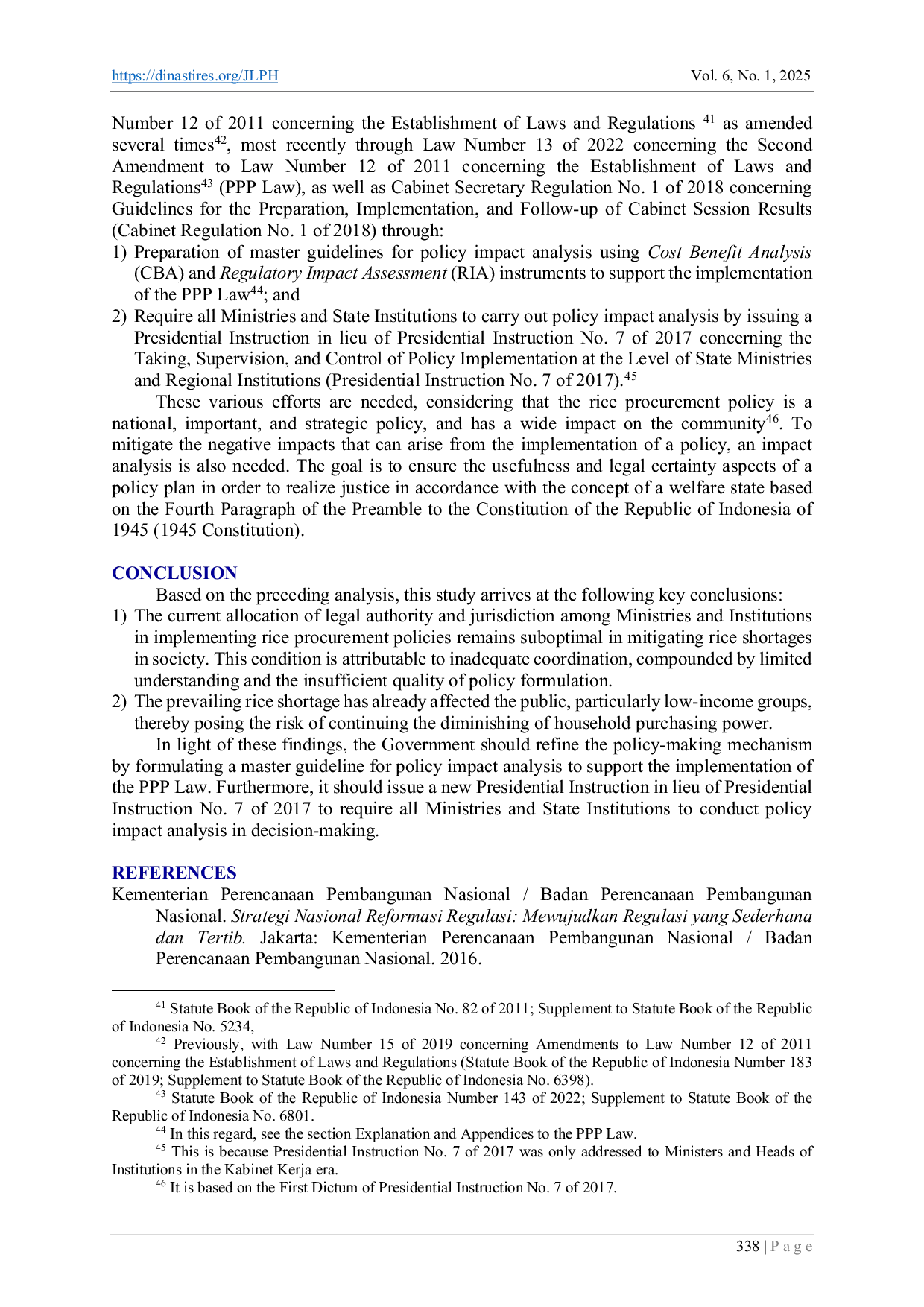 Based on the preceding analysis, this study arrives at the following key conclusions.The current allocation of legal authority and jurisdiction among Ministries and Institutions in implementing rice procurement policies remains suboptimal in mitigating rice shortages in society.This condition is attributable to inadequate coordination, compounded by limited understanding and the insufficient quality of policy formulation.The prevailing rice shortage has already affected the public, particularly low-income groups, thereby posing the risk of continuing the diminishing of household purchasing power.In light of these findings, the Government should refine the policy-making mechanism by formulating a master guideline for policy impact analysis to support the implementation of the PPP Law.Furthermore, it should issue a new Presidential Instruction in lieu of Presidential Instruction No.7 of 2017 to require all Ministries and State Institutions to conduct policy impact analysis in decision-making.