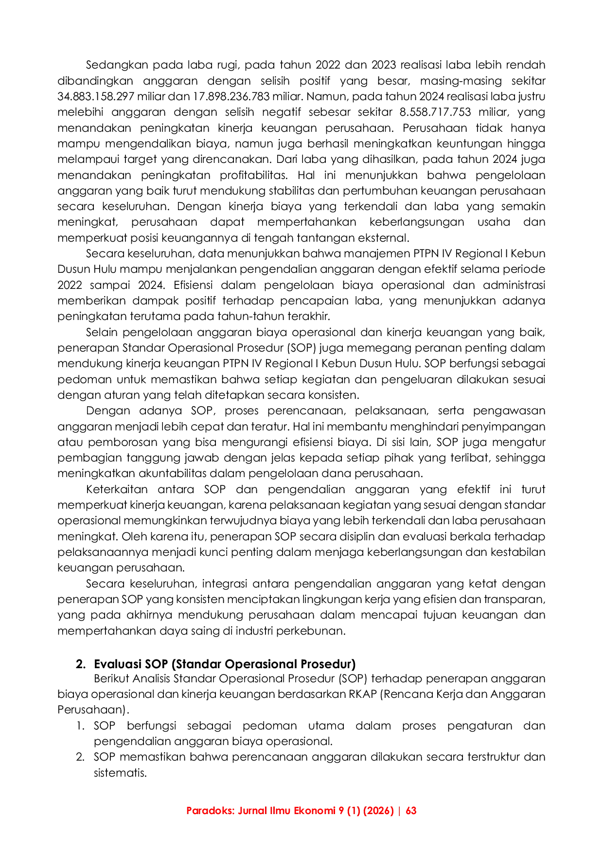 Paradoks : Jurnal Ilmu EkonomiParadoks : Jurnal Ilmu EkonomiPTPN IV Regional 1 Kebun Dusun Hulu menghadapi tantangan dalam mengoptimalkan efisiensi biaya operasional untuk meningkatkan kinerja keuangan, sehingga perlu dilakukan analisis anggaran biaya operasional dan penerapan Standar Operasional Prosedur (SOP) yang efektif. Penelitian ini bertujuan untuk membahas analisis Anggaran Biaya Operasional dan Kinerja Keuangan Dalam Standar Operasional Prosedur (SOP) di PTPN IV Regional 1 Kebun Dusun Hulu. Peneliti menggunakan pendekatan kualitatif dengan studi kasus deskriptif dan analisis data perhitungan varians untuk menganalisis anggaran biaya operasional dan kinerja keuangan di PTPN IV Regional 1 Kebun Dusun Hulu. Teknik pengumpulan data yang digunakan meliputi observasi partisipan dan analisis dokumen. Disimpulkan bahwa PTPN IV Regional I Kebun Dusun Hulu berhasil mengendalikan anggaran biaya operasional secara efektif dari tahun 2022 hingga 2024, yang berdampak positif pada peningkatan kinerja keuangan. Penerapan Standar Operasional Prosedur (SOP) berperan penting dalam memastikan pengelolaan anggaran berjalan terstruktur dan akuntabel. Integrasi pengendalian anggaran yang ketat dengan SOP yang disiplin mendukung tercapainya stabilitas keuangan dan pertumbuhan profitabilitas perusahaan secara berkelanjutan. Berdasarkan keterangan dan hasil diatas, menunjukkan bahwa penerapan SOP efektif dalam memperkuat efisiensi dan akuntabilitas keuangan perkebunan negara.