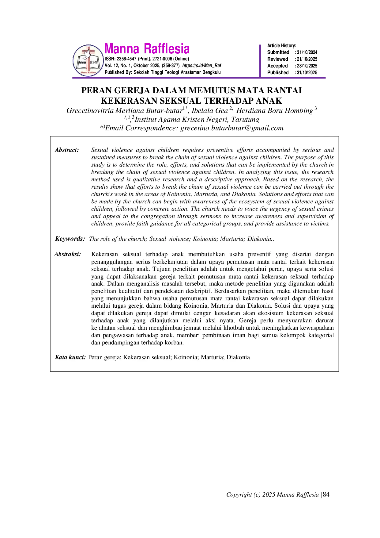 MAN_RAFMAN_RAFKekerasan seksual terhadap anak membutuhkan usaha preventif yang disertai dengan penanggulangan serius berkelanjutan dalam upaya pemutusan mata rantai terkait kekerasan seksual terhadap anak. Tujuan penelitian adalah untuk mengetahui peran, upaya serta solusi yang dapat dilaksanakan gereja terkait pemutusan mata rantai kekerasan seksual terhadap anak. Dalam menganalisis masalah tersebut, maka metode penelitian yang digunakan adalah penelitian kualitatif dan pendekatan deskriptif. Berdasarkan penelitian, maka ditemukan hasil yang menunjukkan bahwa usaha pemutusan mata rantai kekerasan seksual dapat dilakukan melalui tugas gereja dalam bidang Koinonia, Marturia dan Diakonia. Solusi dan upaya yang dapat dilakukan gereja dapat dimulai dengan kesadaran akan ekosistem kekerasan seksual terhadap anak yang dilanjutkan melalui aksi nyata. Gereja perlu menyuarakan darurat kejahatan seksual dan menghimbau jemaat melalui khotbah untuk meningkatkan kewaspadaan dan pengawasan terhadap anak, memberi pembinaan iman bagi semua kelompok kategorial dan pendampingan terhadap korban.