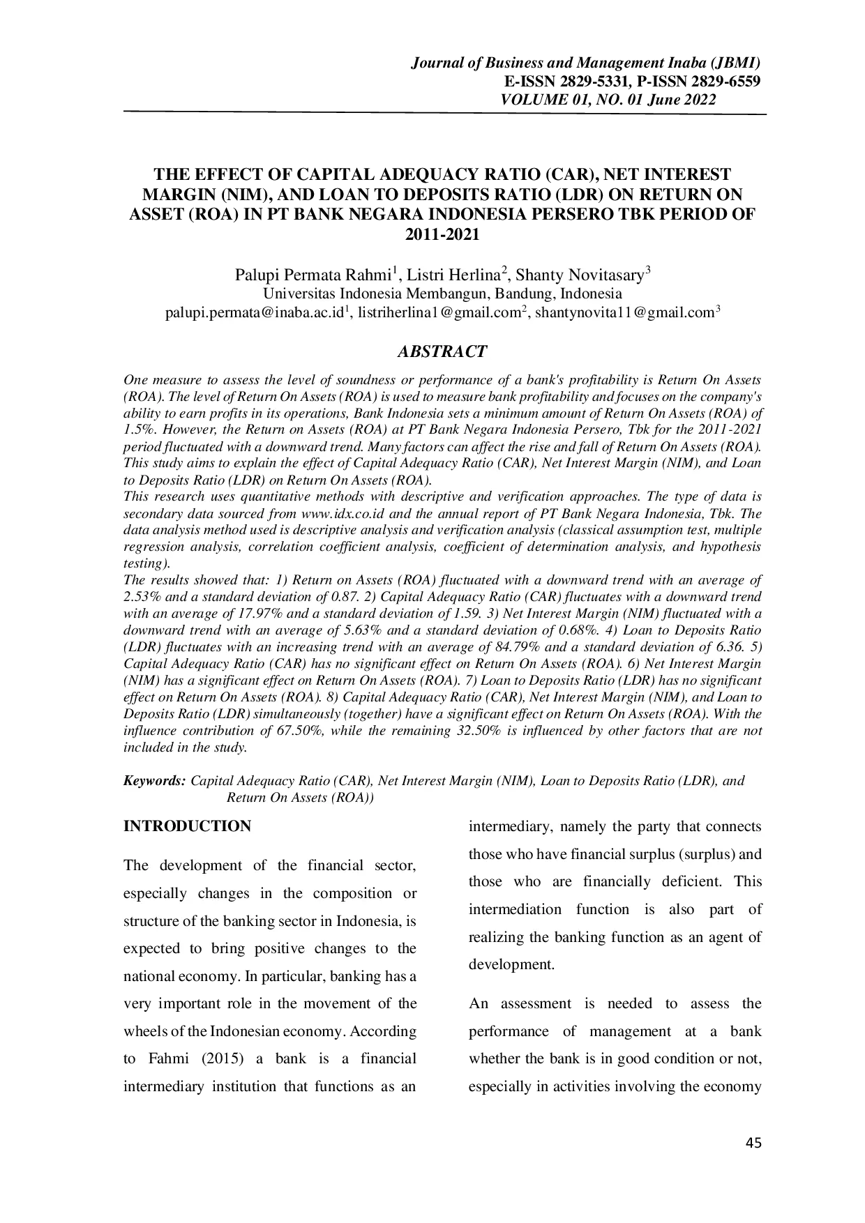 Journal of Business and Management InabaJournal of Business and Management InabaOne measure to assess the level of soundness or performance of a banks profitability is Return On Assets (ROA). The level of Return On Assets (ROA) is used to measure bank profitability and focuses on the companys ability to earn profits in its operations. Bank Indonesia sets a minimum amount of Return On Assets (ROA) of 1.5%. However, the Return on Assets (ROA) at PT Bank Negara Indonesia Persero, Tbk for the 2011-2021 period fluctuated with a downward trend. Many factors can affect the rise and fall of Return On Assets (ROA). This study aims to explain the effect of Capital Adequacy Ratio (CAR), Net Interest Margin (NIM), and Loan to Deposits Ratio (LDR) on Return On Assets (ROA). This research uses quantitative methods with descriptive and verification approaches. The type of data is secondary data sourced from www.idx.co.id and the annual report of PT Bank Negara Indonesia, Tbk. The data analysis method used is descriptive analysis and verification analysis (classical assumption test, multiple regression analysis, correlation coefficient analysis, coefficient of determination analysis, and hypothesis testing). The results showed that: 1) Return on Assets (ROA) fluctuated with a downward trend with an average of 2.53% and a standard deviation of 0.87. 2) Capital Adequacy Ratio (CAR) fluctuates with a downward trend with an average of 17.97% and a standard deviation of 1.59. 3) Net Interest Margin (NIM) fluctuated with a downward trend with an average of 5.63% and a standard deviation of 0.68. 4) Loan to Deposits Ratio (LDR) fluctuates with an increasing trend with an average of 84.79% and a standard deviation of 6.36. 5) Capital Adequacy Ratio (CAR) has no significant effect on Return On Assets (ROA). 6) Net Interest Margin (NIM) has a significant effect on Return On Assets (ROA). 7) Loan to Deposits Ratio (LDR) has no significant effect on Return On Assets (ROA). 8) Capital Adequacy Ratio (CAR), Net Interest Margin (NIM), and Loan to Deposits Ratio (LDR) simultaneously (together) have a significant effect on Return On Assets (ROA). With the influence contribution of 67.50%, while the remaining 32.50% is influenced by other factors that are not included in the study.