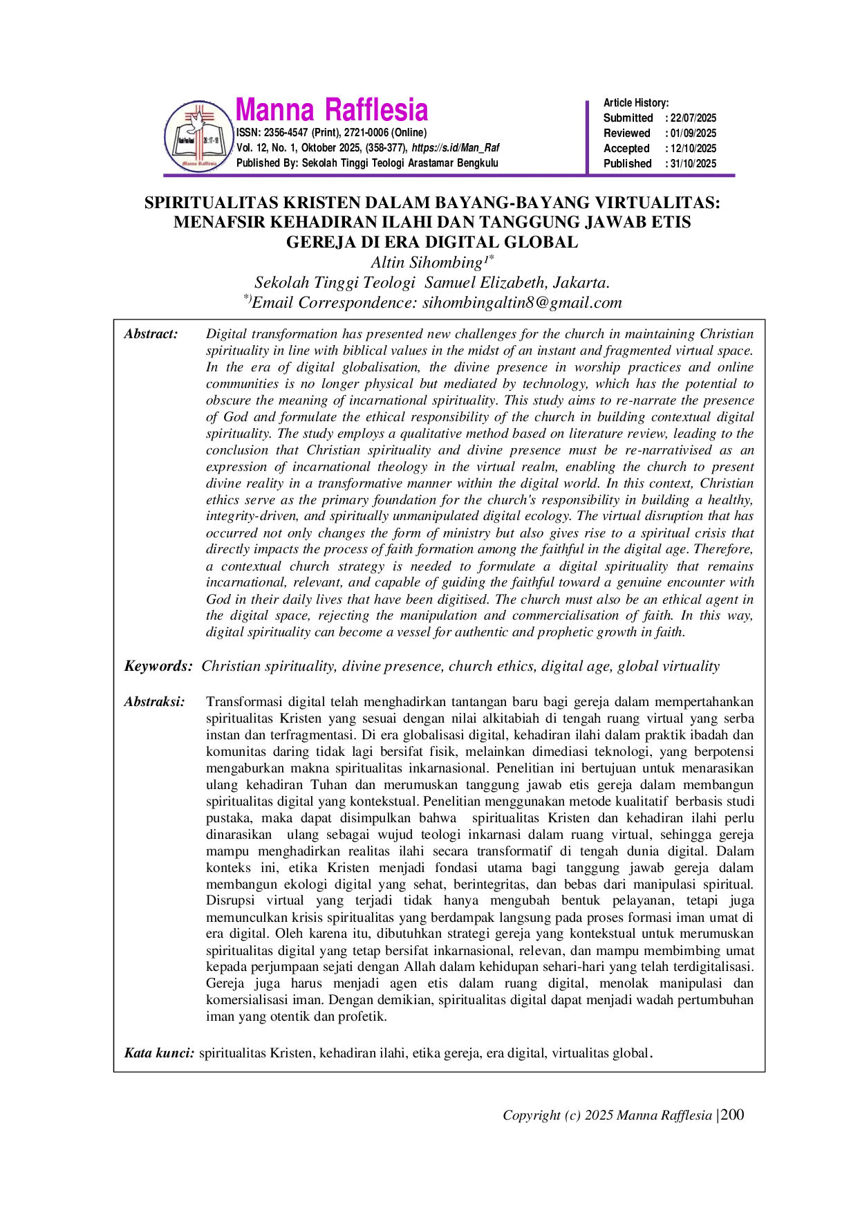 MAN_RAFMAN_RAFTransformasi digital telah menghadirkan tantangan baru bagi gereja dalam mempertahankan spiritualitas Kristen yang sesuai dengan nilai-nilai Alkitabiah di tengah ruang virtual yang serba instan dan terfragmentasi. Di era globalisasi digital, kehadiran ilahi dalam praktik ibadah dan komunitas daring tidak lagi bersifat fisik, melainkan dimediasi teknologi, yang berpotensi mengaburkan makna spiritualitas inkarnasional. Penelitian ini bertujuan untuk menarasikan ulang kehadiran Tuhan dan merumuskan tanggung jawab etis gereja dalam membangun spiritualitas digital yang kontekstual. Penelitian menggunakan metode kualitatif berbasis studi pustaka, maka dapat disimpulkan bahwa spiritualitas Kristen dan kehadiran ilahi perlu dinarasikan ulang sebagai wujud teologi inkarnasi dalam ruang virtual, sehingga gereja mampu menghadirkan realitas ilahi secara transformatif di tengah dunia digital. Dalam konteks ini, etika Kristen menjadi fondasi utama bagi tanggung jawab gereja dalam membangun ekologi digital yang sehat, berintegritas, dan bebas dari manipulasi spiritual. Disrupsi virtual yang terjadi tidak hanya mengubah bentuk pelayanan, tetapi juga memunculkan krisis spiritualitas yang berdampak langsung pada proses formasi iman umat di era digital. Oleh karena itu, dibutuhkan strategi gereja yang kontekstual untuk merumuskan spiritualitas digital yang tetap bersifat inkarnasional, relevan, dan mampu membimbing umat kepada perjumpaan sejati dengan Allah dalam kehidupan sehari-hari yang telah terdigitalisasi. Gereja juga harus menjadi agen etis dalam ruang digital, menolak manipulasi dan komersialisasi iman. Dengan demikian, spiritualitas digital dapat menjadi wadah pertumbuhan iman yang otentik dan profetik.