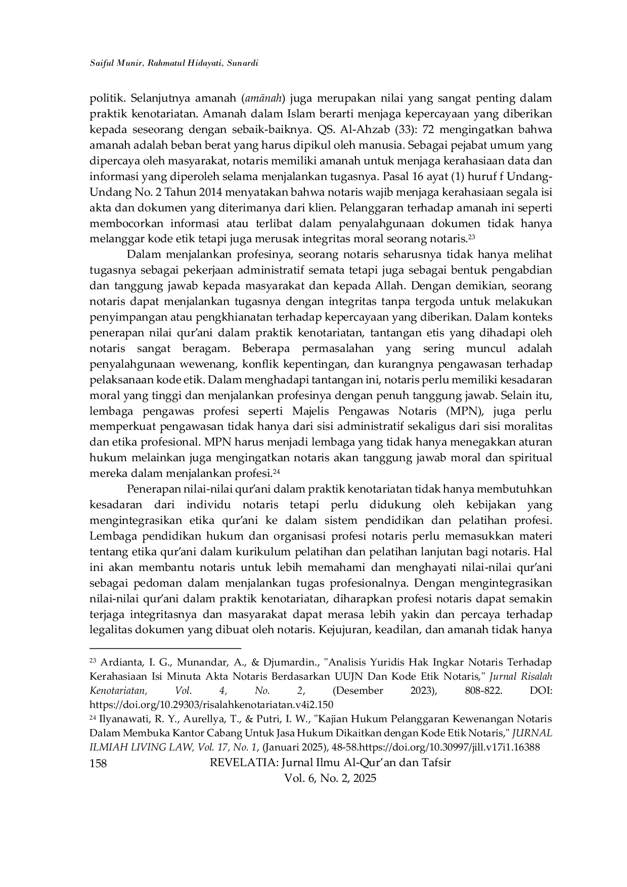 REVELATIA Jurnal Ilmu al-Qur`an dan TafsirREVELATIA Jurnal Ilmu al-Qur`an dan TafsirProfesi notaris memainkan peran penting dalam menjaga kredibilitas praktik konotariatan. Adanya regulasi UU No. 2 Tahun 2014 tentang Jabatan Notaris ternyata belum mampu menegakkan kredibilitas sebab pada faktanya kita kerap menjumpai problem tentang praktik catat-mencatat di Indoenesia yang mencerminkan pencatatan bodong. Penelitian ini mengunakan metode kualitatif-interpretatif yang menuntun peneliti untuk menginterpretasi praktik profesionalitas notaris. Dalam melakukan interpretasi, peneliti mengacu pada QS. Al-Baqarah (2): 282, At-Taubah (9): 119, An-Nahl (16): 90, and Al-Ahzab (33): 72. Hasil penelitian ini menunjukkan bahwa nilai-nilai qurani, seperti kejujuran (ṣidq), keadilan (adl), dan amanah (amānah) sangat berguna dalam membentuk etika profesi notaris. Implementasi nilai-nilai ini dapat memperkuat integritas profesi notaris sebagai pedoman moral dalam menjalankan tugas-fungsinya yang bukan hanya sebagai kewajiban administratif. Penelitian ini mengusulkan perlunya integrasi nilai-nilai qurani dalam pendidikan profesi notaris dan penguatan pengawasan kode etik untuk menciptakan sistem hukum yang lebih bermoral dan berkeadaban.