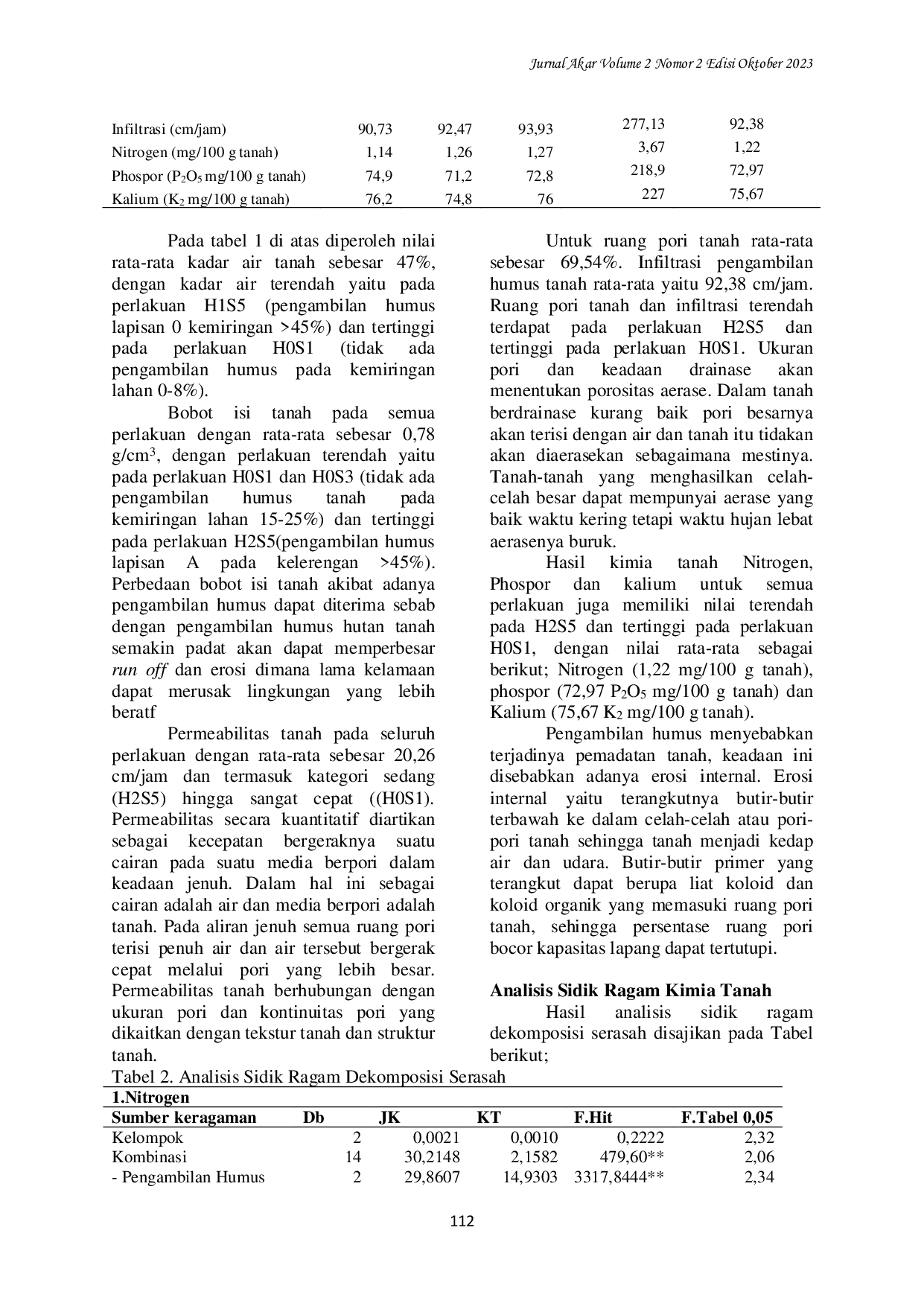 Pengambilan humus hutan berpengaruh sangat nyata terhadap kadar air tanah, bobot isi tanah, total kurang pori, permeabilitas, infiltrasi, sehingga mengakibatkan nilai sifat-sifat tanah tersebut menurut kualitasnya.Kemiringan lereng berpengaruh sangat nyata terhadap kadar air tanah, total pori, permeabilitas, ruang infiltrasi, N, P dan K.Interaksi pengambilan humus hutan dan kemiringan lereng berpengaruh nyata terhadap Kalium, permeabilitas, bobot isi, infiltrasi dan Posfor.