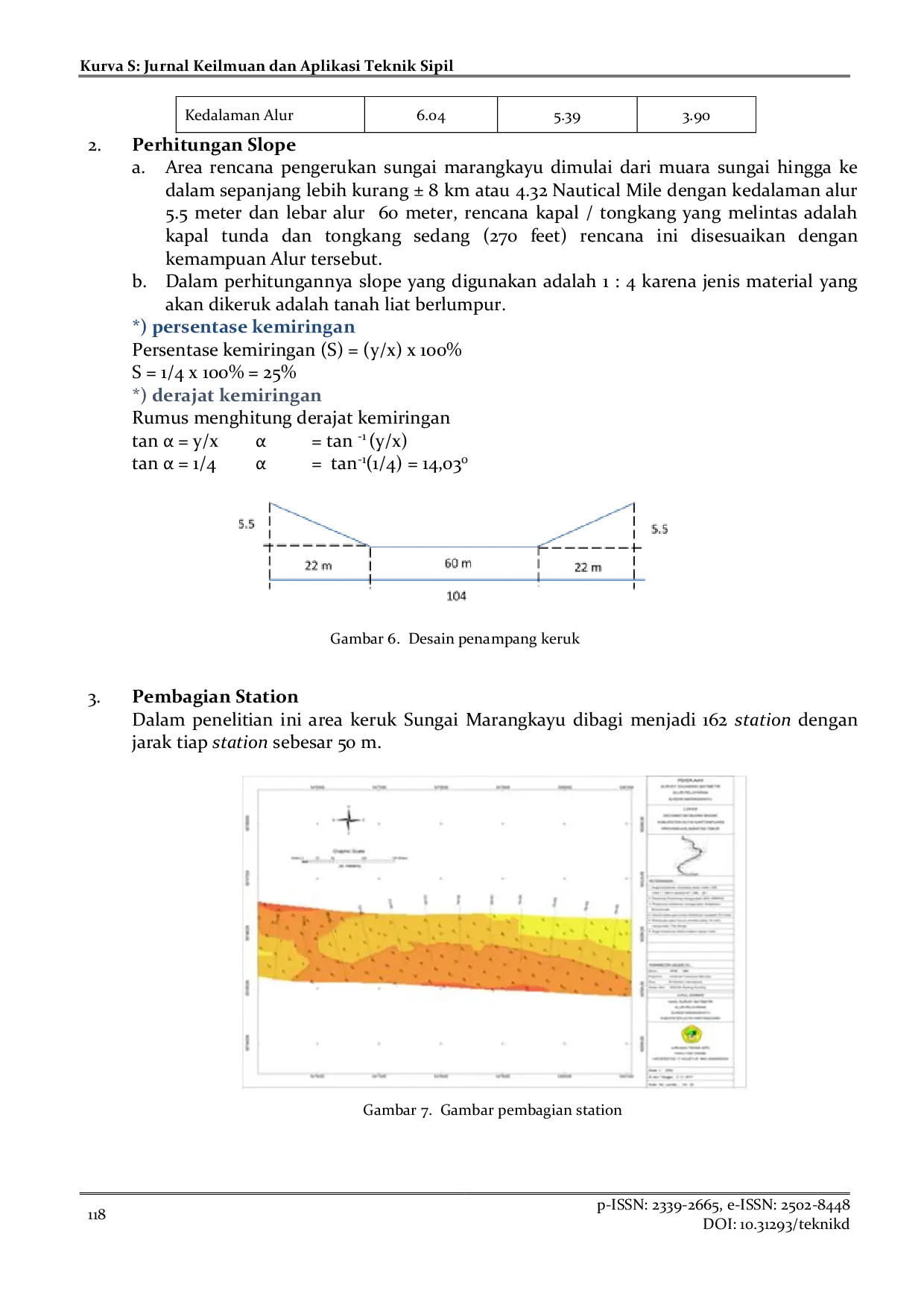 Kurva S : Jurnal Keilmuan dan Aplikasi Teknik SipilKurva S : Jurnal Keilmuan dan Aplikasi Teknik SipilSungai Marangkayu terletak di Kecamatan Muara Badak, Kabupaten Kutai Kartanegara. Hulu sungai terkendala dalam mengoptimalkan pemanfaatan dermaga, akibat pendangkalan sungai. Tujuan dari penelitian ini adalah untuk mendapatkan data bathimetri yang digunakan sebagai acuan perhitungan volume material yang akan dikeruk, disesuaikan dengan rencana kapal yang akan melintas dimana volume tersebut nantinya akan digunakan sebagai dasar penyusunan Rencana Anggaran Biaya pengerukan. Metode yang digunakan bersifat “kuantitatif dan matematis yaitu pengumpulan data yang diperoleh dari hasil pendataan dan pengukuran dilapangan. Dari hasil pengukuran dan perhitungan diketahui kedalaman sungai marangkayu berkisar antara 0.5 s/d 8.0 m LWS. Akan direncanakan untuk dilakukan pengerukan sepanjang 8 km, lebar 60 m dan kedalaman 5.5 m LWS dengan slope yang akan digunakan adalah 1 : 4 didapatkan volume pengerukan sebesar 1.297.117,49 m3 dengan luas area sebesar 26.257,34 m2. Rencana Anggaran Biaya yang dibutuhkan untuk melakukan kegiatan ini adalah sebesar Rp. 137.662.170.000,-.