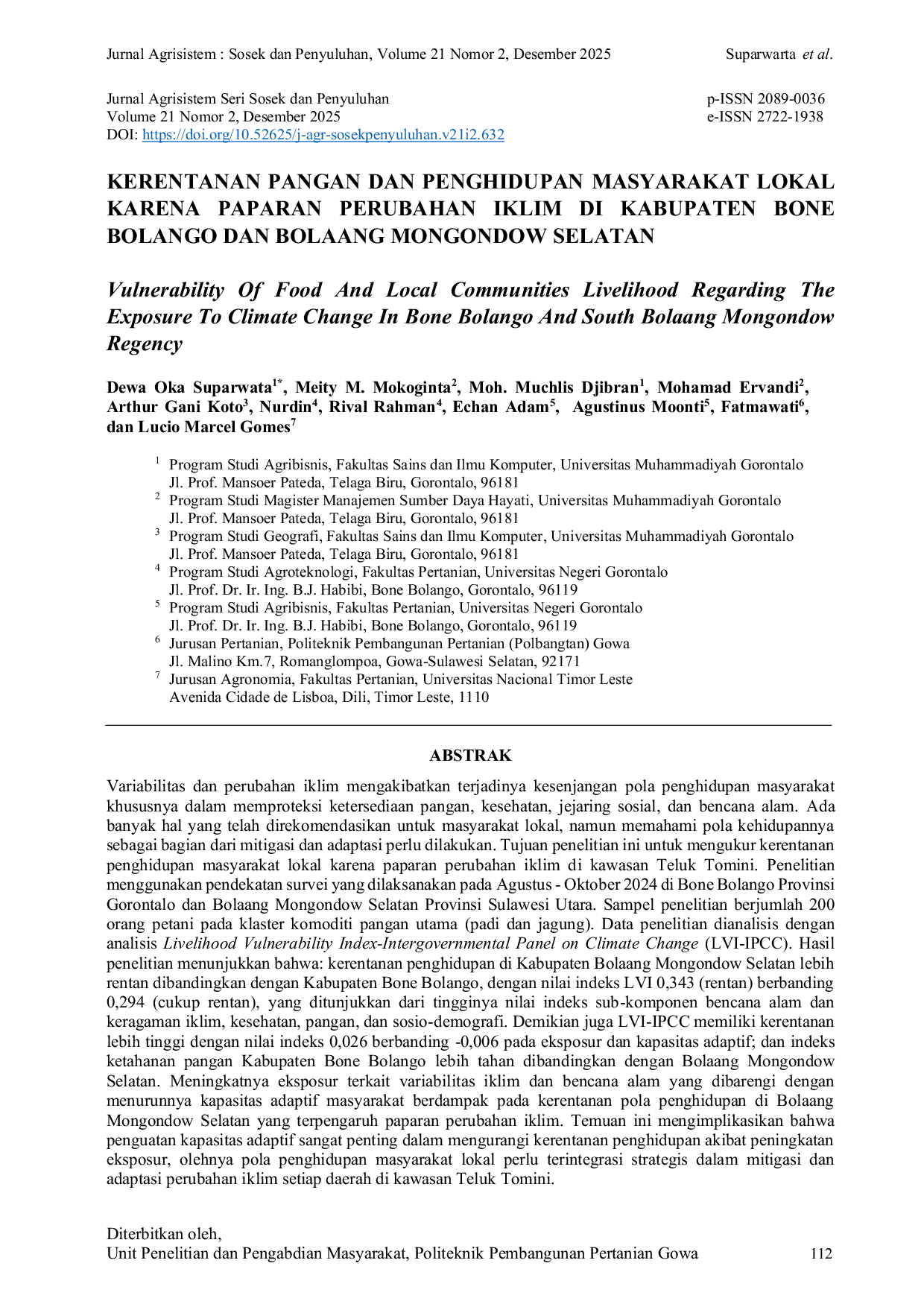 Jurnal Agrisistem: Seri Sosek dan PenyuluhanJurnal Agrisistem: Seri Sosek dan PenyuluhanVariabilitas dan perubahan iklim mengakibatkan terjadinya kesenjangan pola penghidupan masyarakat khususnya dalam memproteksi ketersediaan pangan, kesehatan, jejaring sosial, dan bencana alam. Tujuan penelitian ini untuk mengukur kerentanan penghidupan masyarakat lokal karena paparan perubahan iklim di kawasan Teluk Tomini. Penelitian menggunakan pendekatan survei yang dilaksanakan pada Agustus - Oktober 2024 di Bone Bolango Provinsi Gorontalo dan Bolaang Mongondow Selatan Provinsi Sulawesi Utara. Hasil penelitian menunjukkan bahwa: kerentanan penghidupan di Kabupaten Bolaang Mongondow Selatan lebih rentan dibandingkan dengan Kabupaten Bone Bolango, dengan nilai indeks LVI 0,343 (rentan) berbanding 0,294 (cukup rentan). Meningkatnya eksposur terkait variabilitas iklim dan bencana alam yang dibarengi dengan menurunnya kapasitas adaptif masyarakat berdampak pada kerentanan pola penghidupan di Bolaang Mongondow Selatan yang terpengaruh paparan perubahan iklim. Temuan ini mengimplikasikan bahwa penguatan kapasitas adaptif sangat penting dalam mengurangi kerentanan penghidupan akibat peningkatan eksposur, olehnya pola penghidupan masyarakat lokal perlu terintegrasi strategis dalam mitigasi dan adaptasi perubahan iklim setiap daerah di kawasan Teluk Tomini.