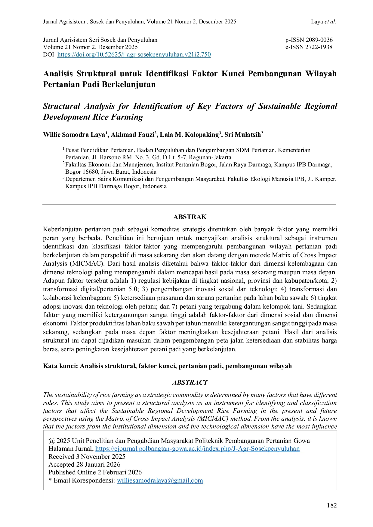 Jurnal Agrisistem: Seri Sosek dan PenyuluhanJurnal Agrisistem: Seri Sosek dan PenyuluhanKeberlanjutan pertanian padi sebagai komoditas strategis ditentukan oleh banyak faktor yang memiliki peran berbeda. Penelitian ini bertujuan untuk menyajikan analisis struktural sebagai instrumen identifikasi dan klasifikasi faktor-faktor yang mempengaruhi pembangunan wilayah pertanian padi berkelanjutan dalam perspektif di masa sekarang dan akan datang dengan metode Matrix of Cross Impact Analysis (MICMAC). Dari hasil analisis diketahui bahwa faktor-faktor dari dimensi kelembagaan dan dimensi teknologi paling mempengaruhi dalam mencapai hasil pada masa sekarang maupun masa depan. Adapun faktor tersebut adalah regulasi kebijakan di tingkat nasional, provinsi dan kabupaten/kota; transformasi digital/pertanian 5.0; pengembangan inovasi sosial dan teknologi; transformasi dan kolaborasi kelembagaan; ketersediaan prasarana dan sarana pertanian pada lahan baku sawah; tingkat adopsi inovasi dan teknologi oleh petani; dan petani yang tergabung dalam kelompok tani. Sedangkan faktor yang memiliki ketergantungan sangat tinggi adalah faktor-faktor dari dimensi sosial dan dimensi ekonomi. Faktor produktifitas lahan baku sawah per tahun memiliki ketergantungan sangat tinggi pada masa sekarang, sedangkan pada masa depan faktor meningkatkan kesejahteraan petani. Hasil dari analisis struktural ini dapat dijadikan masukan dalam pengembangan peta jalan ketersediaan dan stabilitas harga beras, serta peningkatan kesejahteraan petani padi yang berkelanjutan.