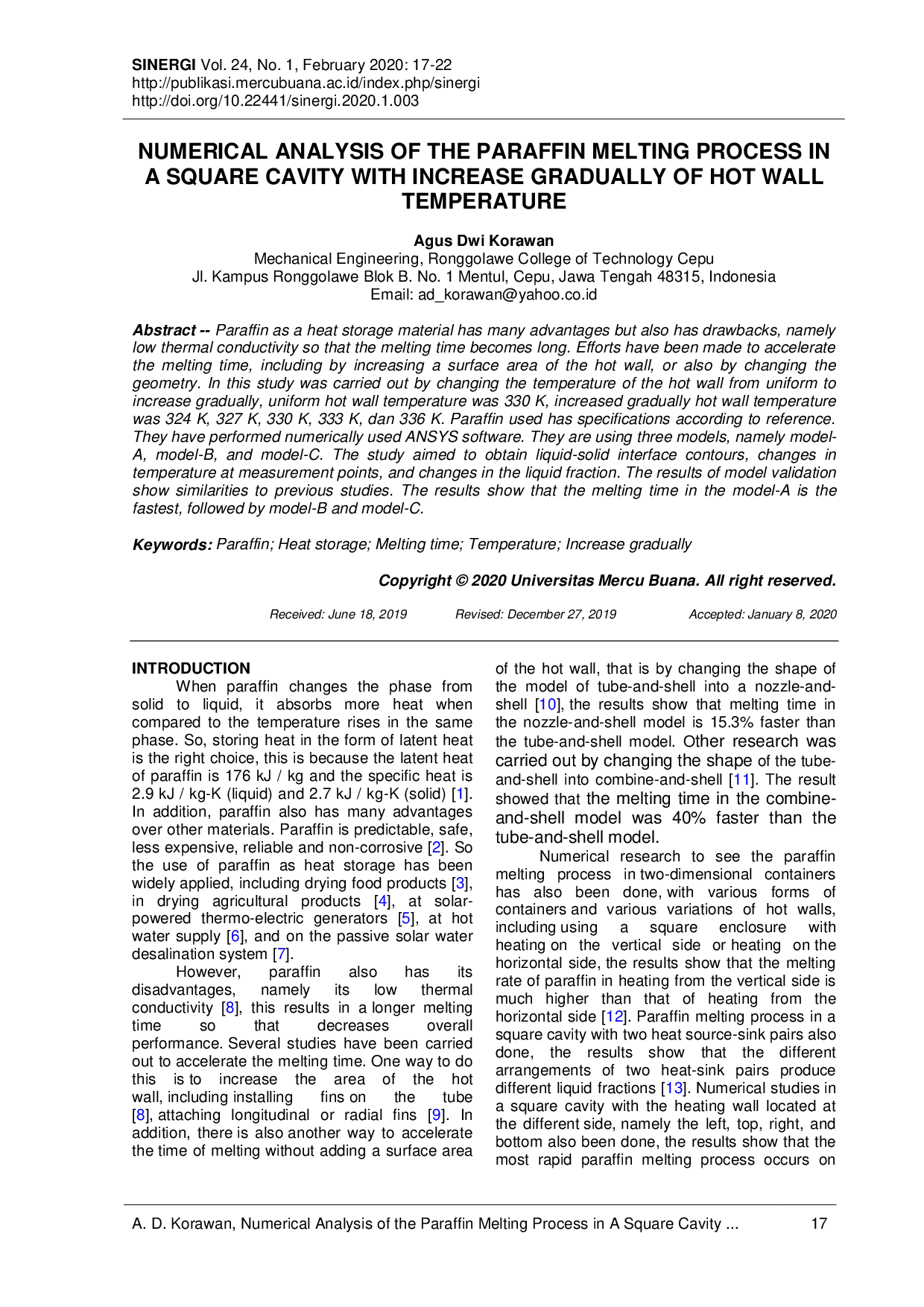 SINERGISINERGIParaffin sebagai bahan penyimpan panas memiliki banyak keunggulan tetapi juga memiliki kelemahan, yaitu konduktivitas termal yang rendah sehingga waktu mencair menjadi lebih lama. Upaya telah dilakukan untuk mempercepat waktu mencair, termasuk dengan meningkatkan luas permukaan dinding panas atau mengubah geometri. Dalam penelitian ini, suhu dinding panas diubah dari seragam menjadi meningkat secara bertahap, dengan suhu dinding panas seragam sebesar 330 K dan suhu dinding panas meningkat bertahap sebesar 324 K, 327 K, 330 K, 333 K, dan 336 K. Paraffin yang digunakan memiliki spesifikasi sesuai referensi. Penelitian dilakukan secara numerik menggunakan perangkat lunak ANSYS. Mereka menggunakan tiga model, yaitu model-A, model-B, dan model-C. Studi bertujuan untuk mendapatkan kontur antarmuka cair-padat, perubahan suhu pada titik pengukuran, dan perubahan fraksi cair. Hasil validasi model menunjukkan kesamaan dengan studi sebelumnya. Hasil menunjukkan bahwa waktu mencair pada model-A paling cepat, diikuti oleh model-B dan model-C.