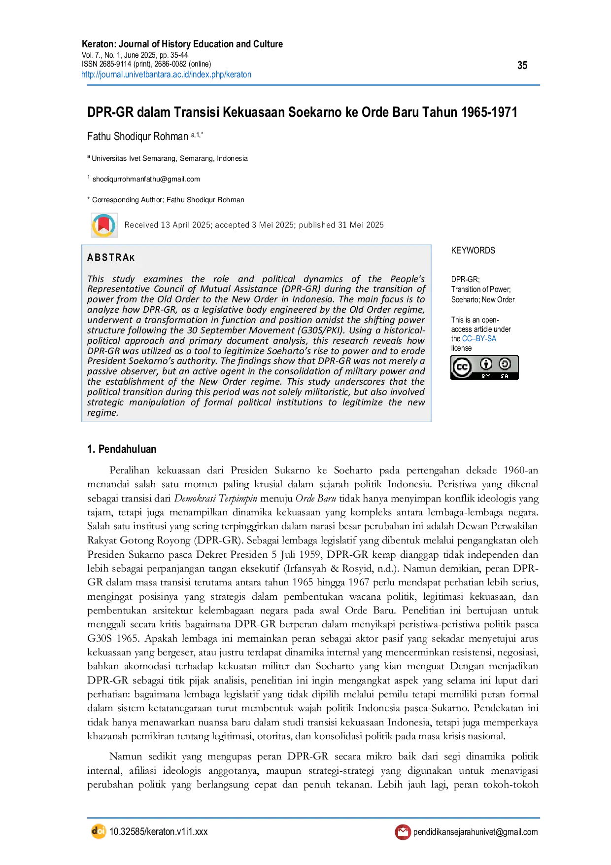 Keraton: Journal of History Education and CultureKeraton: Journal of History Education and CulturePenelitian ini mengkaji peran dan dinamika politik Dewan Perwakilan Rakyat Gotong Royong (DPR-GR) selama transisi kekuasaan dari Orde Lama ke Orde Baru di Indonesia. Fokus utamanya adalah menganalisis bagaimana DPR-GR, sebagai badan legislatif yang direkayasa oleh rezim Orde Lama, mengalami transformasi fungsi dan posisi di tengah pergeseran struktur kekuasaan setelah Gerakan 30 September (G30S/PKI). Dengan menggunakan pendekatan historis-politik dan analisis dokumen primer, penelitian ini mengungkap bagaimana DPR-GR dimanfaatkan sebagai alat untuk melegitimasi kenaikan kekuasaan Soeharto dan mengikis otoritas Presiden Soekarno. Temuan menunjukkan bahwa DPR-GR bukan hanya pengamat pasif, melainkan agen aktif dalam konsolidasi kekuasaan militer dan pembentukan rezim Orde Baru. Studi ini menekankan bahwa transisi politik selama periode ini tidak semata-mata bersifat militeristik, tetapi juga melibatkan manipulasi strategis institusi politik formal untuk melegitimasi rezim baru.