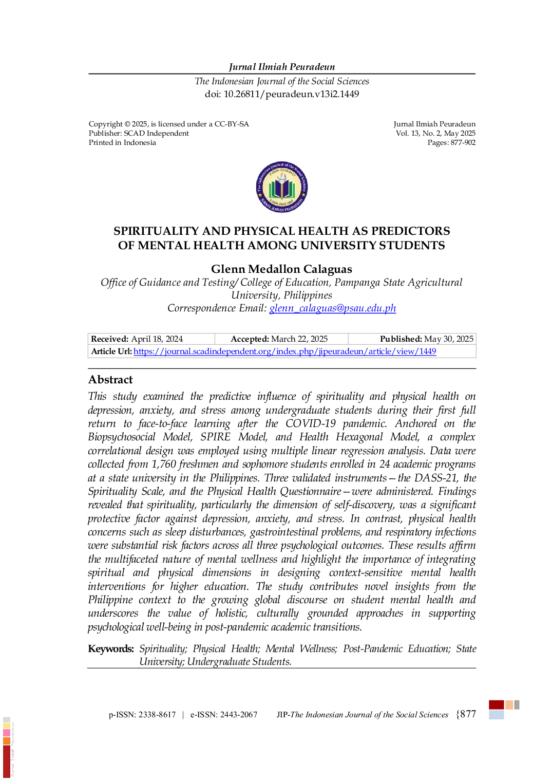 Jurnal Ilmiah PeuradeunJurnal Ilmiah PeuradeunPenelitian ini mengkaji pengaruh prediktif spiritualitas dan kesehatan fisik terhadap depresi, kecemasan, dan stres di kalangan mahasiswa sarjana selama periode kembali penuh ke pembelajaran tatap muka pertama mereka setelah pandemi COVID-19. Berlandaskan pada Model Biopsikososial, Model SPIRE, dan Model Heksagonal Kesehatan, desain korelasional kompleks digunakan dengan analisis regresi linier berganda. Data dikumpulkan dari 1.760 mahasiswa baru dan tahun kedua yang terdaftar dalam 24 program akademik di sebuah universitas negeri di Filipina. Tiga instrumen tervalidasi—DASS-21, Skala Spiritualitas, dan Kuesioner Kesehatan Fisik—diberikan. Temuan menunjukkan bahwa spiritualitas, khususnya dimensi penemuan diri, merupakan faktor pelindung yang signifikan terhadap depresi, kecemasan, dan stres. Sebaliknya, masalah kesehatan fisik seperti gangguan tidur, masalah pencernaan, dan infeksi pernapasan merupakan faktor risiko substansial di ketiga hasil psikologis tersebut. Hasil ini menegaskan sifat multifaset kesejahteraan mental dan menyoroti pentingnya mengintegrasikan dimensi spiritual dan fisik dalam merancang intervensi kesehatan mental yang peka konteks untuk pendidikan tinggi. Penelitian ini menyumbangkan wawasan baru dari konteks Filipina ke dalam diskursus global yang berkembang tentang kesehatan mental mahasiswa dan menggarisbawahi nilai pendekatan holistik yang berakar budaya dalam mendukung kesejahteraan psikologis selama transisi akademik pascapandemi.