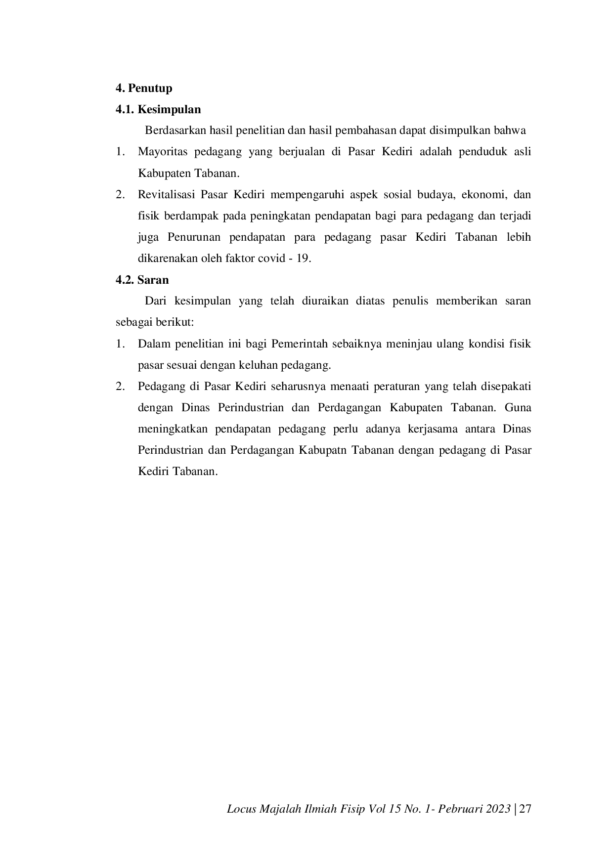 1. Bagaimana dampak jangka panjang revitalisasi pasar tradisional terhadap dinamika sosial ekonomi pedagang kecil? 2. Apa strategi yang efektif untuk meningkatkan efisiensi pasar pasca-pandemi berdasarkan kondisi fisik dan struktur pasar saat ini? 3. Bagaimana partisipasi komunitas lokal dapat dikembangkan untuk memperkuat manajemen pasar tradisional dalam menghadapi tantangan ekonomi global?.