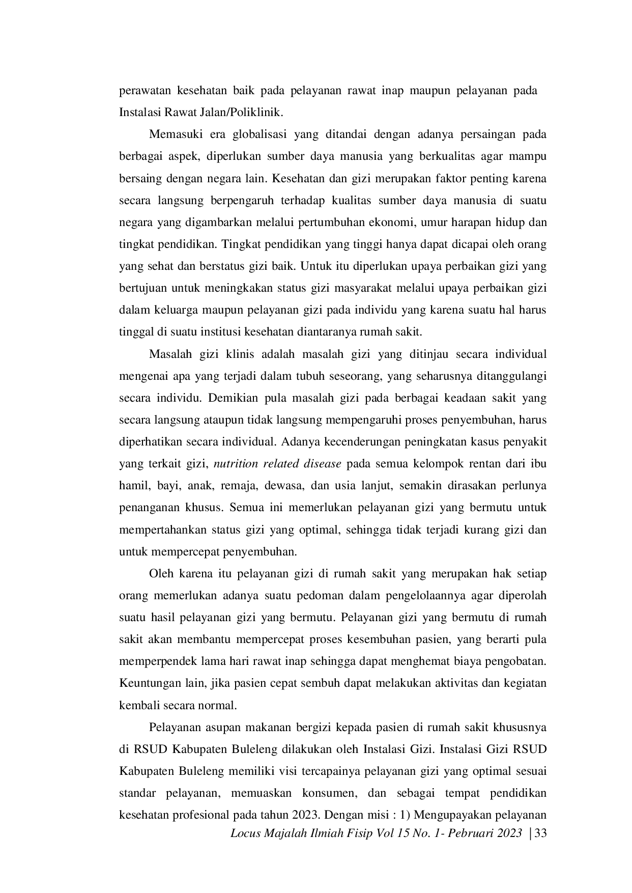 LocusLocusTerpenuhinya kebutuhan gizi pasien dengan menu makanan yang sehat dan bergizi akan sangat membantu proses kesembuhan pasien. Untuk itu manajemen yang baik harus dilakukan oleh Instalasi Gizi yang menangani langsung permasalahan tersebut. Penelitian ini bertujuan untuk memahami manajemen Instalasi Gizi RSUD Kabupaten Buleleng dan faktor-faktor yang mendukung serta menghambatnya. Penelitian ini menggunakan pendekatan kualitatif dengan teknik pengumpulan data observasi, wawancara, dan pemanfaatan dokumen. Analisis data dilakukan secara sirkuler, meliputi pengumpulan data, reduksi data, penyajian data, serta simpulan dan verifikasi.