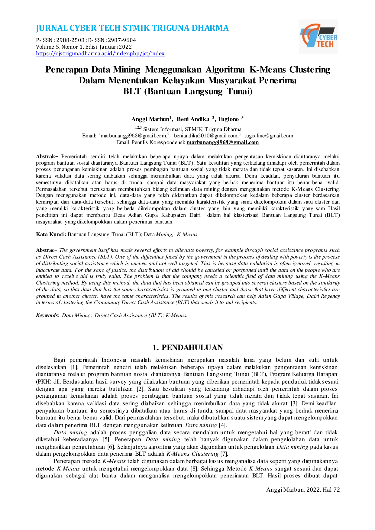 Jurnal Cyber TechJurnal Cyber TechPemerintah telah melakukan berbagai upaya pengentasan kemiskinan, termasuk program Bantuan Langsung Tunai (BLT). Namun, proses pembagian bantuan sering tidak merata dan tidak tepat sasaran karena validasi data yang kurang, sehingga data menjadi tidak akurat. Penelitian ini menggunakan data mining dengan algoritma K-Means Clustering untuk mengelompokkan data penerima BLT berdasarkan kemiripan karakteristik, sehingga membantu desa Adian Gupa, Kabupaten Dairi, dalam menyeleksi penerima yang layak. Hasil penelitian menunjukkan bahwa metode ini dapat memperbaiki keakuratan dan keadilan penyaluran bantuan.