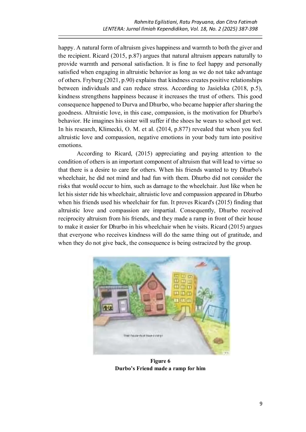 Lentera: Jurnal Ilmiah KependidikanLentera: Jurnal Ilmiah KependidikanAltruisme umumnya disajikan dalam literatur anak sebagai kebajikan moral fundamental yang mendorong kebaikan, empati, dan perilaku prososial. Penelitian ini mengkaji konsekuensi perilaku altruistik dalam tiga buku bergambar pilihan: Little Miss Mary and the Big Monster Makeover oleh G. G. Toropov dan Cleone Cassidy (2008), Harold Loves His Woolly Hat oleh Vern Kousky (2018), dan My Brothers Wheeeeelchair oleh Salil Chaturvedi (2019). Dengan menggunakan desain penelitian interpretatif kualitatif, studi ini melakukan analisis tekstual dan visual mendalam untuk mengeksplorasi bagaimana perilaku altruistik dibangun dan bagaimana konsekuensinya direpresentasikan dalam elemen naratif dan ilustratif. Temuan menunjukkan bahwa perilaku altruistik dalam buku-buku bergambar ini menghasilkan konsekuensi yang kompleks, termasuk kerentanan emosional, negosiasi identitas, dan tanggung jawab sosial yang berkelanjutan. Meskipun tindakan altruistik mendorong empati, penerimaan, dan inklusi, tindakan tersebut juga mengekspos karakter pada risiko emosional, pengorbanan pribadi, dan kewajiban moral. Studi ini berkontribusi pada keilmuan literatur anak dengan menawarkan perspektif kritis tentang representasi moral dan menekankan pentingnya mengakui dimensi emosional dari perilaku altruistik dalam narasi untuk pembaca muda.