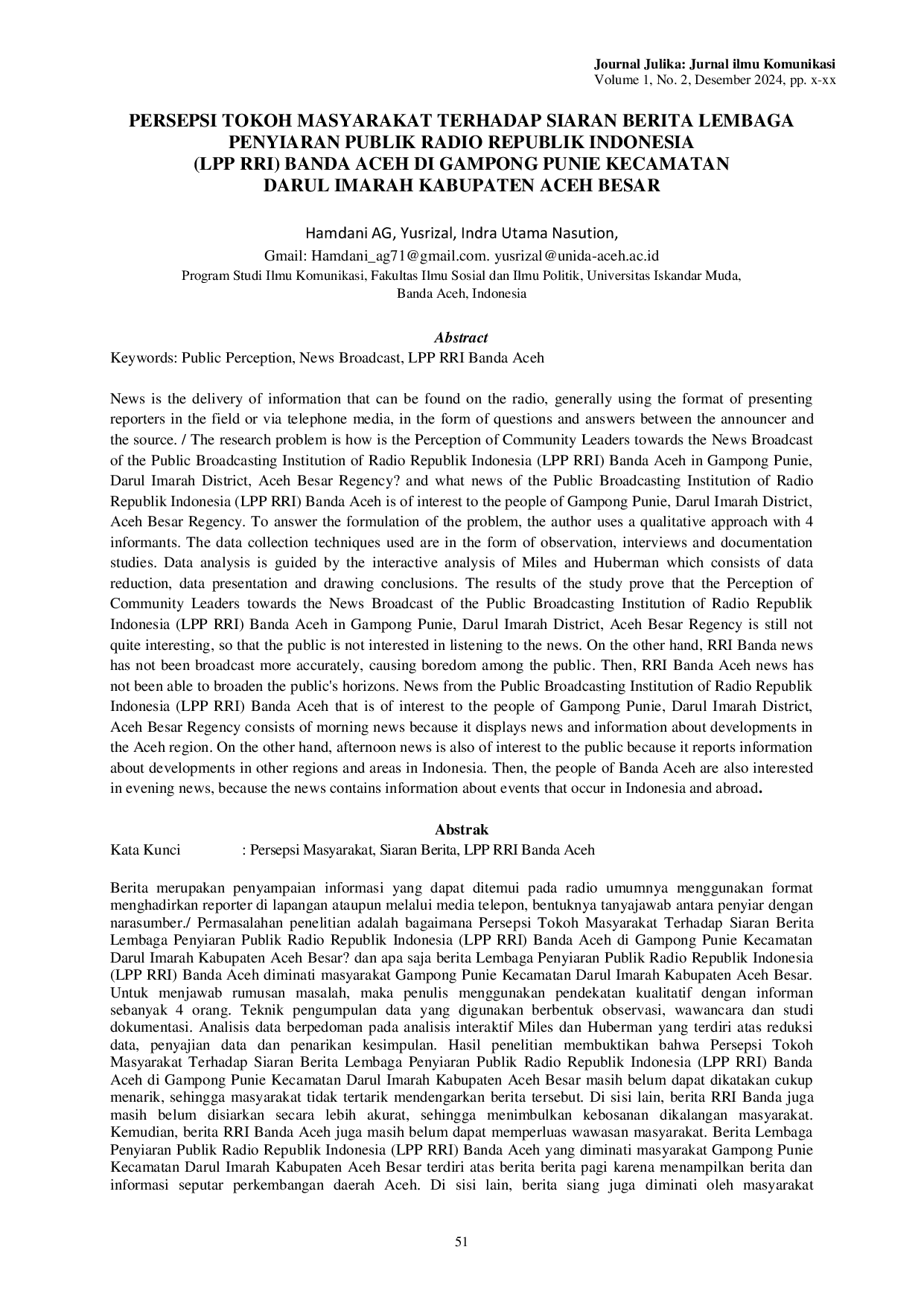 Jurnal Ilmu KomunikasiJurnal Ilmu KomunikasiBerita merupakan penyampaian informasi yang dapat ditemui pada radio umumnya menggunakan format menghadirkan reporter di lapangan ataupun melalui media telepon, bentuknya tanyajawab antara penyiar dengan narasumber./ Permasalahan penelitian adalah bagaimana Persepsi Tokoh Masyarakat Terhadap Siaran Berita Lembaga Penyiaran Publik Radio Republik Indonesia (LPP RRI) Banda Aceh di Gampong Punie Kecamatan Darul Imarah Kabupaten Aceh Besar? dan apa saja berita Lembaga Penyiaran Publik Radio Republik Indonesia (LPP RRI) Banda Aceh diminati masyarakat Gampong Punie Kecamatan Darul Imarah Kabupaten Aceh Besar. Untuk menjawab rumusan masalah, maka penulis menggunakan pendekatan kualitatif dengan informan sebanyak 4 orang. Teknik pengumpulan data yang digunakan berbentuk observasi, wawancara dan studi dokumentasi. Analisis data berpedoman pada analisis interaktif Miles dan Huberman yang terdiri atas reduksi data, penyajian data dan penarikan kesimpulan. Hasil penelitian membuktikan bahwa Persepsi Tokoh Masyarakat Terhadap Siaran Berita Lembaga Penyiaran Publik Radio Republik Indonesia (LPP RRI) Banda Aceh di Gampong Punie Kecamatan Darul Imarah Kabupaten Aceh Besar masih belum dapat dikatakan cukup menarik, sehingga masyarakat tidak tertarik mendengarkan berita tersebut. Di sisi lain, berita RRI Banda juga masih belum disiarkan secara lebih akurat, sehingga menimbulkan kebosanan dikalangan masyarakat. Kemudian, berita RRI Banda Aceh juga masih belum dapat memperluas wawasan masyarakat. Berita Lembaga Penyiaran Publik Radio Republik Indonesia (LPP RRI) Banda Aceh yang diminati masyarakat Gampong Punie Kecamatan Darul Imarah Kabupaten Aceh Besar terdiri atas berita berita pagi karena menampilkan berita dan informasi seputar perkembangan daerah Aceh. Di sisi lain, berita siang juga diminati oleh masyarakat karena memberitakan informasi mengenai perkembangan daerah dan wilayah lain di Indonesia. Kemudian, masyarakat Banda Aceh juga meminati berita sore, karena berita tersebut mengandung informasi seputar peristiwa yang terjadi di Indonesia maupun luar negeri.
