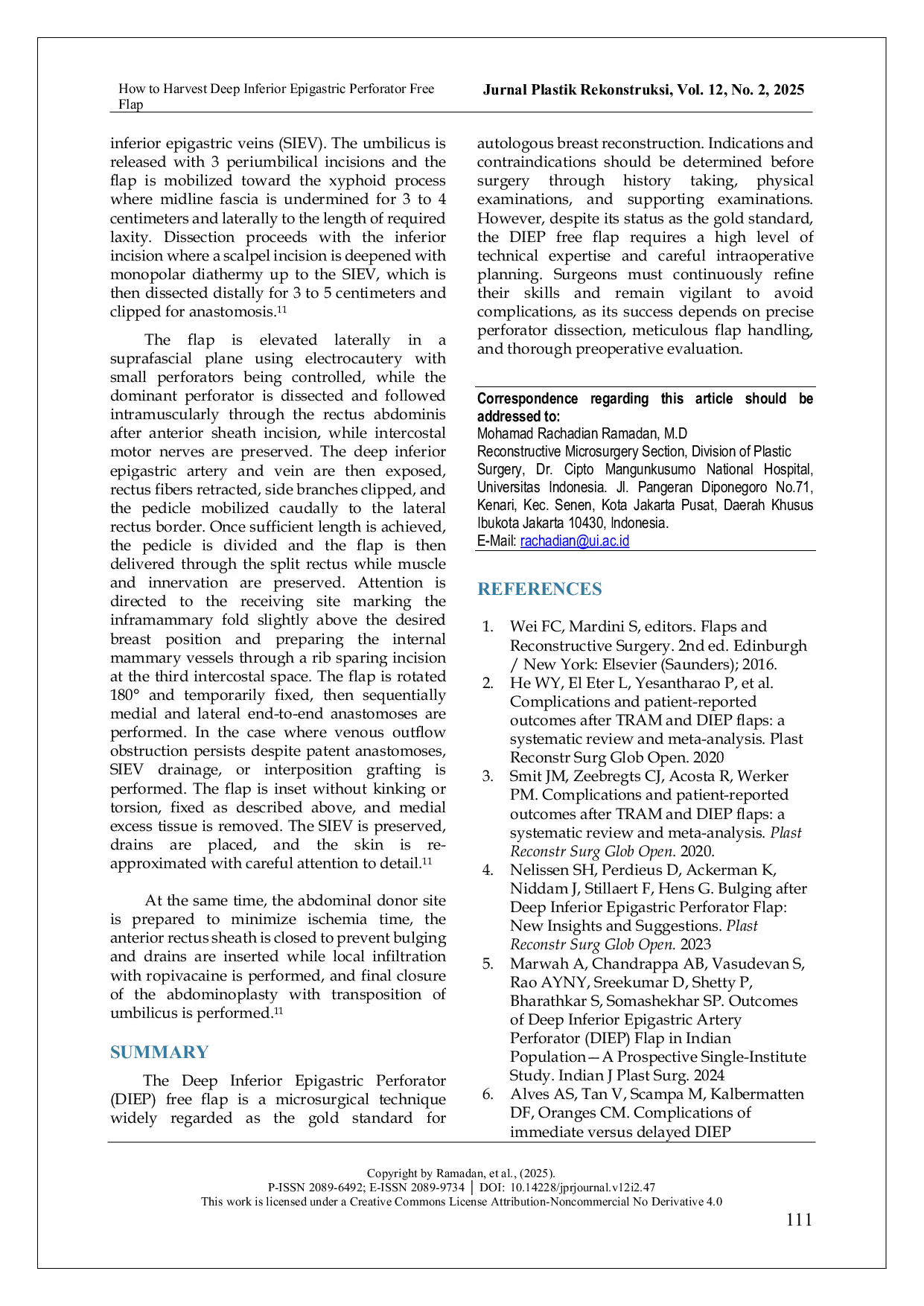 Jurnal Plastik RekonstruksiJurnal Plastik RekonstruksiDeep Inferior Epigastric Perforator (DIEP) free flap adalah teknik rekonstruksi payudara mikrosurgical yang menggunakan kulit dan jaringan lemak subkutan dari perut bagian bawah tanpa mengorbankan otot rektus abdominis. Pendekatan ini menghasilkan bentuk payudara yang tampak alami dengan morbiditas donor site yang minimal dibandingkan dengan TRAM flap, sehingga mengurangi risiko kelemahan otot dan hernia dinding perut. Keunggulannya meliputi pemulihan pascaoperasi yang lebih cepat, kontur perut yang lebih baik, serta hasil estetika jangka panjang karena payudara hasil rekonstruksi mempertahankan volumenya seiring waktu. Namun, teknik ini menuntut keterampilan tinggi, memerlukan waktu operasi lebih lama, dan memiliki risiko kegagalan flap atau komplikasi vaskular jika tidak berhasil. Prosedur dilakukan dengan membedah pembuluh perforator dari sistem epigastrik inferior profunda, memindahkan jaringan ke area dada, dan menyambungkan pembuluh darah di bawah mikroskop. Hasil yang diharapkan adalah bentuk payudara yang lembut dan alami dengan tingkat kepuasan pasien yang tinggi, meskipun keahlian bedah dan pemilihan pasien yang tepat sangat penting untuk meminimalkan komplikasi dan memastikan hasil optimal.