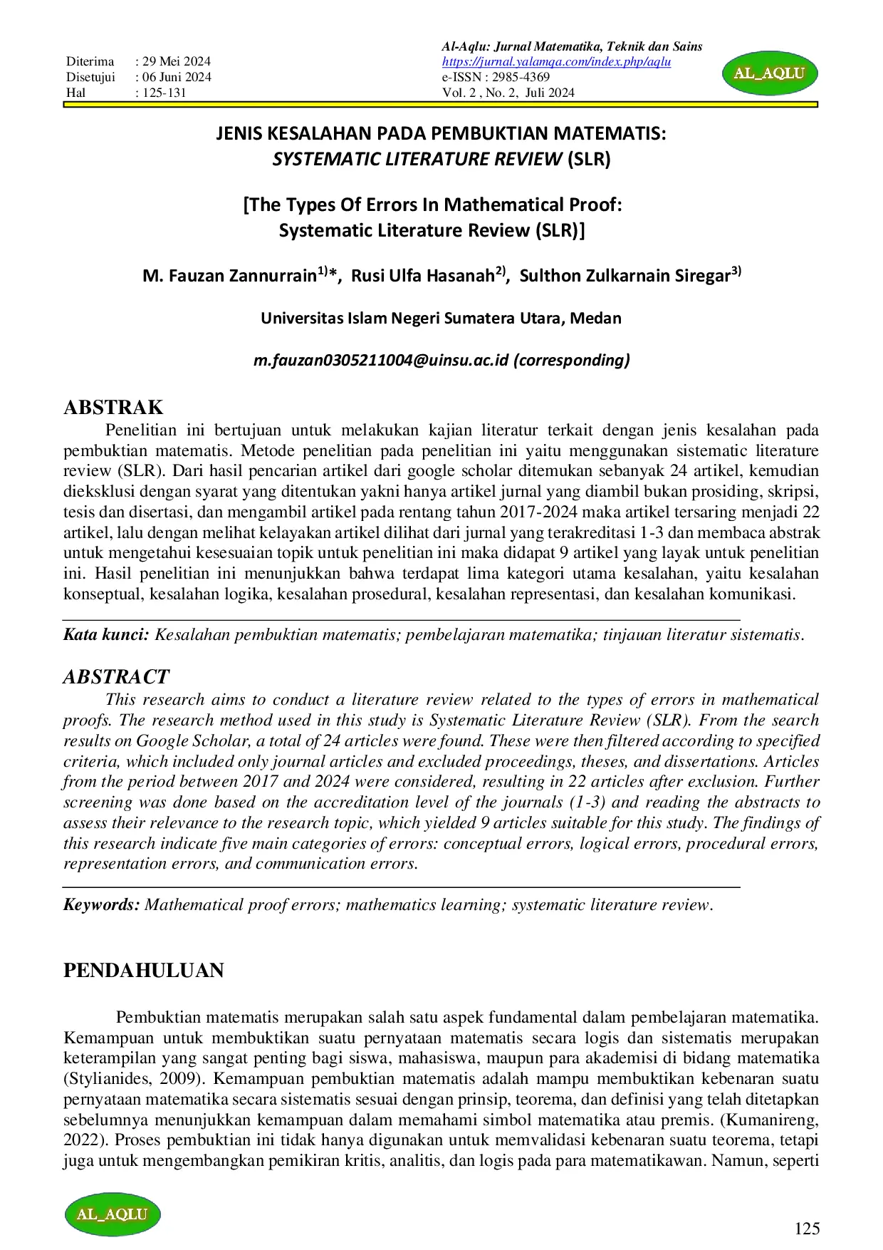 Al-Aqlu: Jurnal Matematika, Teknik dan SainsAl-Aqlu: Jurnal Matematika, Teknik dan SainsPenelitian ini bertujuan untuk melakukan kajian literatur terkait dengan jenis kesalahan pada pembuktian matematis. Metode penelitian pada penelitian ini yaitu menggunakan systematic literature review (SLR). Dari hasil pencarian artikel dari google scholar ditemukan sebanyak 24 artikel, kemudian dieksklusi dengan syarat yang ditentukan yakni hanya artikel jurnal yang diambil bukan prosiding, skripsi, tesis dan disertasi, dan mengambil artikel pada rentang tahun 2017-2024 maka artikel tersaring menjadi 22 artikel, lalu dengan melihat kelayakan artikel dilihat dari jurnal yang terakreditasi 1-3 dan membaca abstrak untuk mengetahui kesesuaian topik untuk penelitian ini maka didapat 9 artikel yang layak untuk penelitian ini. Hasil penelitian ini menunjukkan bahwa terdapat lima kategori utama kesalahan, yaitu kesalahan konseptual, kesalahan logika, kesalahan prosedural, kesalahan representasi, dan kesalahan komunikasi.