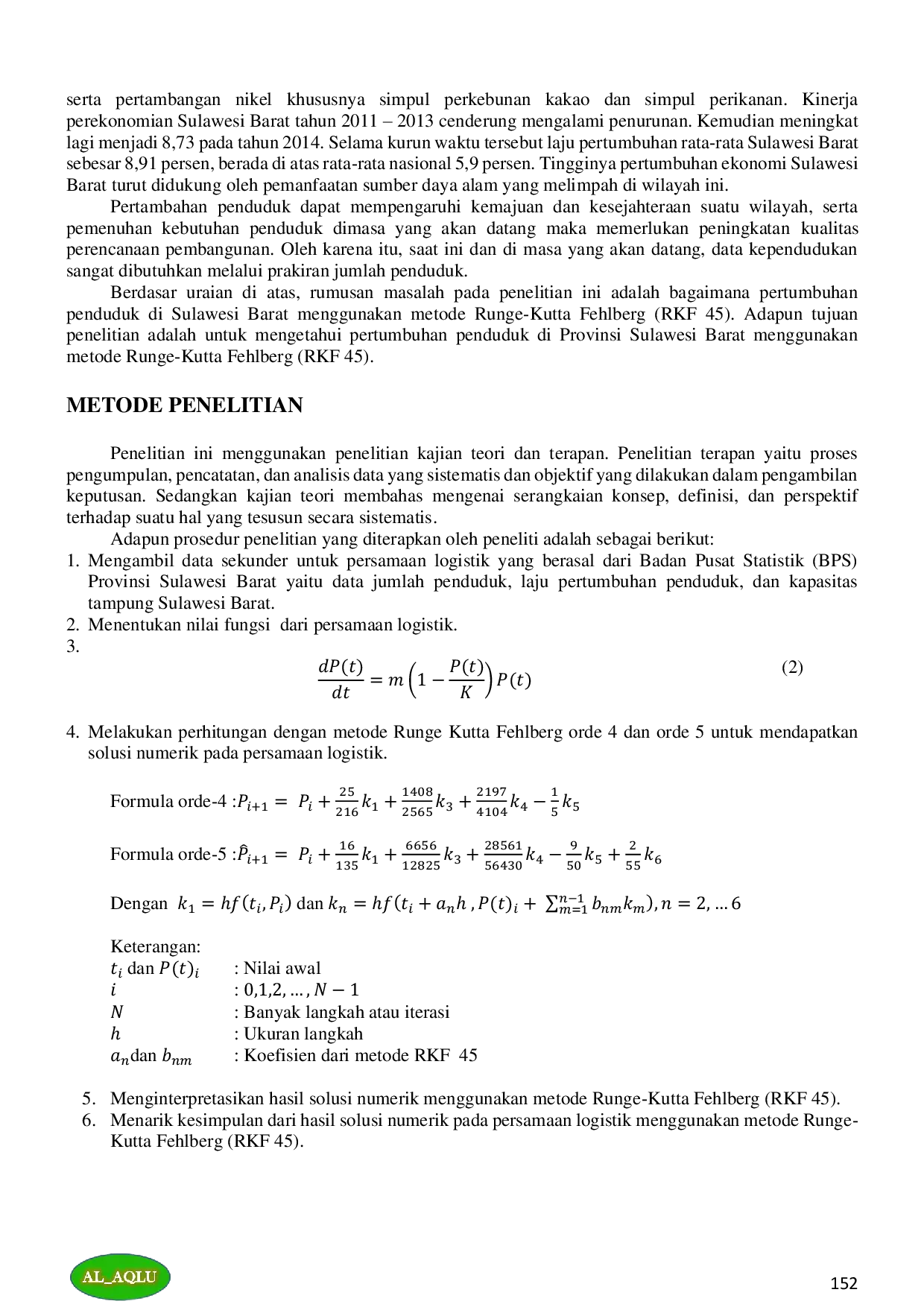 Berdasarkan tujuan dari penelitian dan hasil yang diperoleh, maka dapat disimpulkan bahwa metode Runge Kutta Fehlberg (RKF 45) dapat diterapkan pada persamaan logistik dalam memprediksi jumlah penduduk di Sulawesi Barat.Adapun solusi numerik menggunakan metode Runge Kutta Fehlberg (RKF 45) dengan ukuran langkah ℎ = 0,01 didapatkan untuk 0,01 Tahun yaitu 1.319 jiwa dan untuk prediksi 10 tahun ke depan, diperoleh hasil yaitu jumlah penduduk (𝑃) sebesar 1.Pertumbuhan penduduk di Sulawesi Barat mengalami peningkatan dari nilai awal yang diberikan.Pertambahan penduduk berdasarkan hasil prediksi selama 10 tahun sebanyak 86.913 jiwa atau rata-rata 9,0 jiwa setiap tahun.