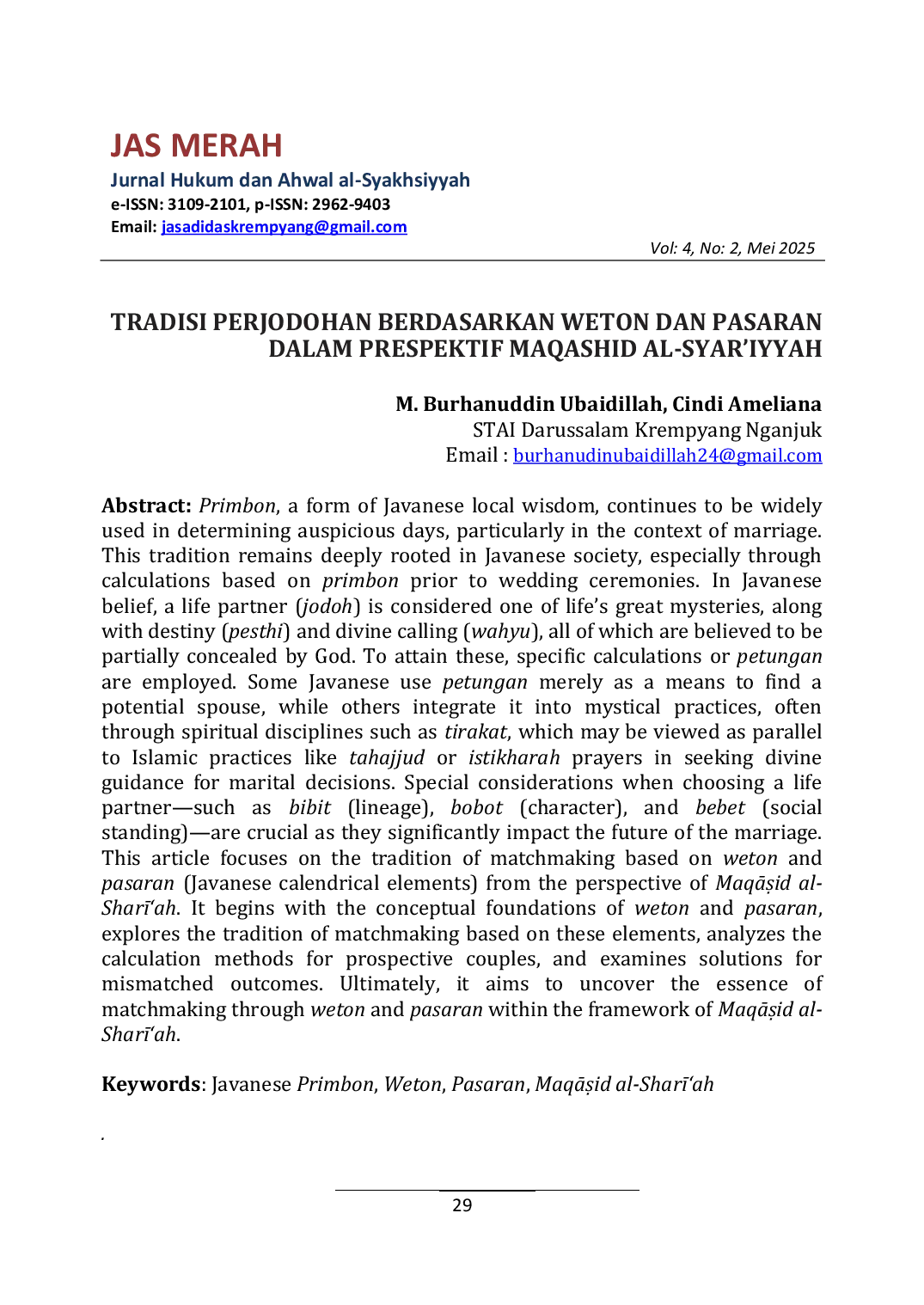 JAS MERAH: Jurnal Hukum dan Ahwal al-SyakhsiyyahJAS MERAH: Jurnal Hukum dan Ahwal al-SyakhsiyyahPrimbon, sebagai bentuk kearifan lokal Jawa, masih banyak digunakan untuk menentukan hari baik, khususnya dalam konteks pernikahan. Tradisi ini tetap berakar kuat dalam masyarakat Jawa, terutama melalui perhitungan berbasis primbon sebelum upacara pernikahan. Dalam kepercayaan Jawa, pasangan hidup (jodoh) dianggap sebagai salah satu misteri besar kehidupan, bersama takdir (pesthi) dan panggilan ilahi (wahyu), yang diyakini sebagian disembunyikan oleh Tuhan. Untuk mencapainya, dilakukan perhitungan khusus atau petungan. Sebagian orang Jawa menggunakan petungan semata‑mata sebagai sarana mencari calon pasangan, sementara yang lain mengintegrasikannya dalam praktik mistik, sering melalui disiplin spiritual seperti tirakat, yang dapat dipandang paralel dengan praktik Islam seperti salat tahajjud atau istikharah dalam mencari petunjuk ilahi untuk keputusan pernikahan. Pertimbangan khusus dalam memilih pasangan hidup—seperti bibit (garis keturunan), bobot (karakter), dan bebet (status sosial)—merupakan faktor penting karena secara signifikan memengaruhi masa depan pernikahan. Artikel ini memusatkan perhatian pada tradisi perjodohan berdasarkan weton dan pasaran (elemen kalender Jawa) dari perspektif Maqāṣid al‑Sharīah. Artikel dimulai dengan landasan konseptual weton dan pasaran, mengeksplorasi tradisi perjodohan berbasis elemen tersebut, menganalisis metode perhitungan bagi calon pasangan, serta meneliti solusi untuk hasil yang tidak cocok. Pada akhirnya, artikel ini berupaya mengungkap esensi perjodohan melalui weton dan pasaran dalam kerangka Maqāṣid al‑Sharīah.