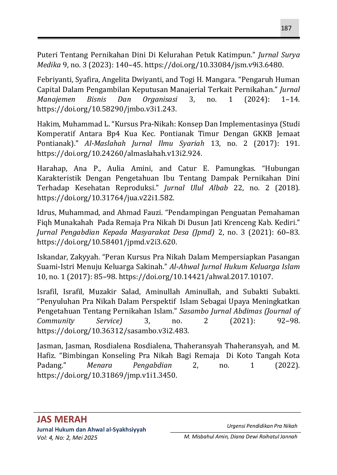 Pendidikan pra nikah memiliki urgensi yang semakin meningkat seiring dengan kompleksitas kondisi sosial di Indonesia, termasuk tingginya angka pernikahan dini, perceraian, dan kekerasan dalam rumah tangga.Pendidikan ini penting untuk membekali calon pasangan suami istri dengan pengetahuan dan keterampilan yang diperlukan dalam menjalani kehidupan berkeluarga.Dengan peningkatan kurikulum, metode pembelajaran yang interaktif, evaluasi program, dan sinergi antar lembaga, pendidikan pra nikah dapat berperan signifikan dalam membentuk keluarga yang harmonis dan mencegah masalah sosial terkait pernikahan.