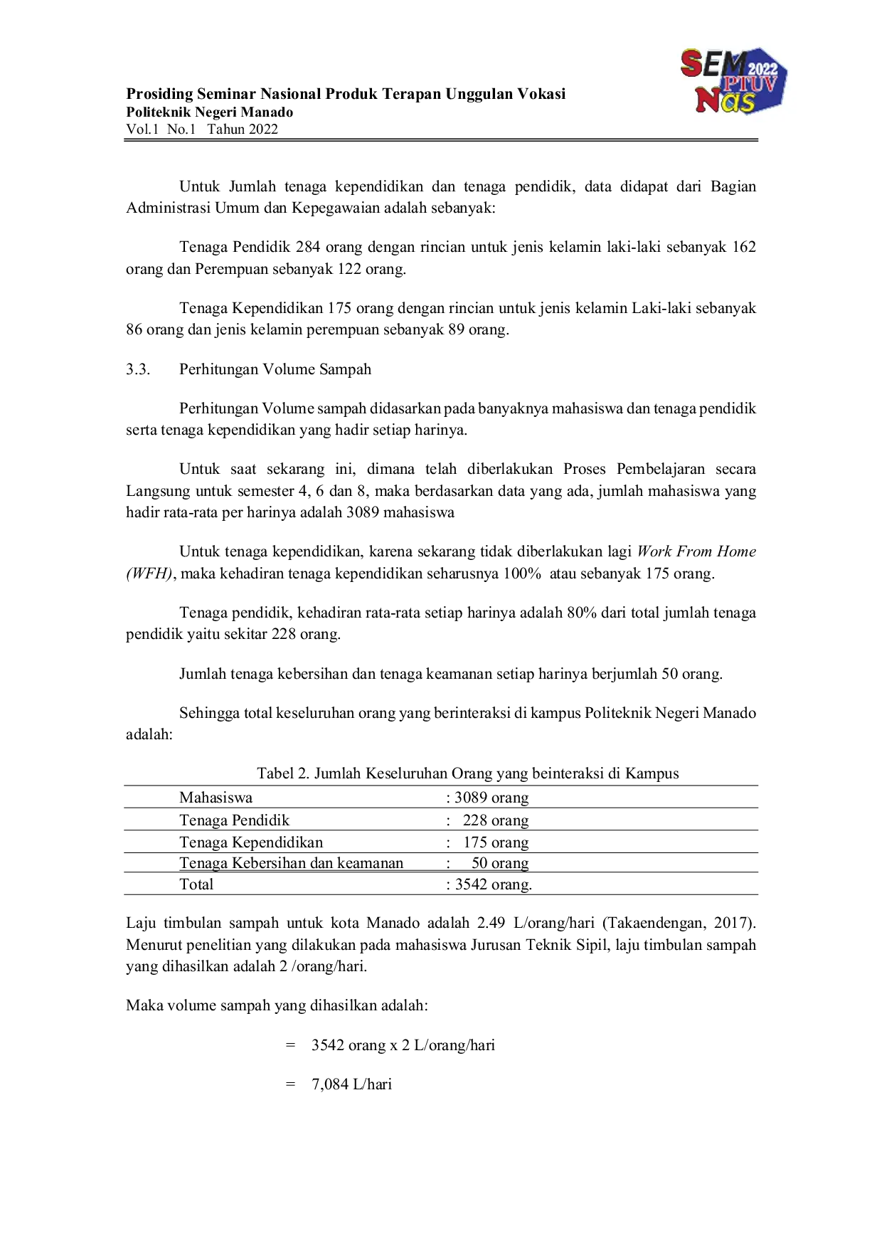 Prosiding Seminar Nasional Produk Terapan Unggulan VokasiProsiding Seminar Nasional Produk Terapan Unggulan VokasiPoliteknik Negeri Manado merupakan salah satu perguruan tinggi negeri yang didirikan pada tahun 1985. Seiring dengan bertambahnya tahun, jumlah jurusan dan mahasiswa Politeknik Negeri Manado semakin meningkat. Seperti halnya kota yang harus mengelola sistem persampahannya, demikian juga dengan fasilitas pendidikan. Politeknik Negeri Manado wajib mengelola sistem persampahannya sendiri. Tujuan penelitian ini adalah untuk melihat banyaknya sampah yang dihasilkan, komposisinya, dan sistem persampahan yang diterapkan. Metode yang digunakan adalah observasi langsung untuk mendapatkan data primer. Sistem pengelolaan persampahan di kampus Politeknik Negeri Manado sudah cukup baik. Laju timbulan sampah adalah 2 L/org/hari, dengan jumlah orang yang berinteraksi di kampus sebanyak 2543 orang, sehingga jumlah sampah yang dihasilkan per hari adalah 7,8 m3/hari. Komposisi sampah yang dihasilkan adalah plastic 50%, kertas 40%, dan sampah lainnya 10%.