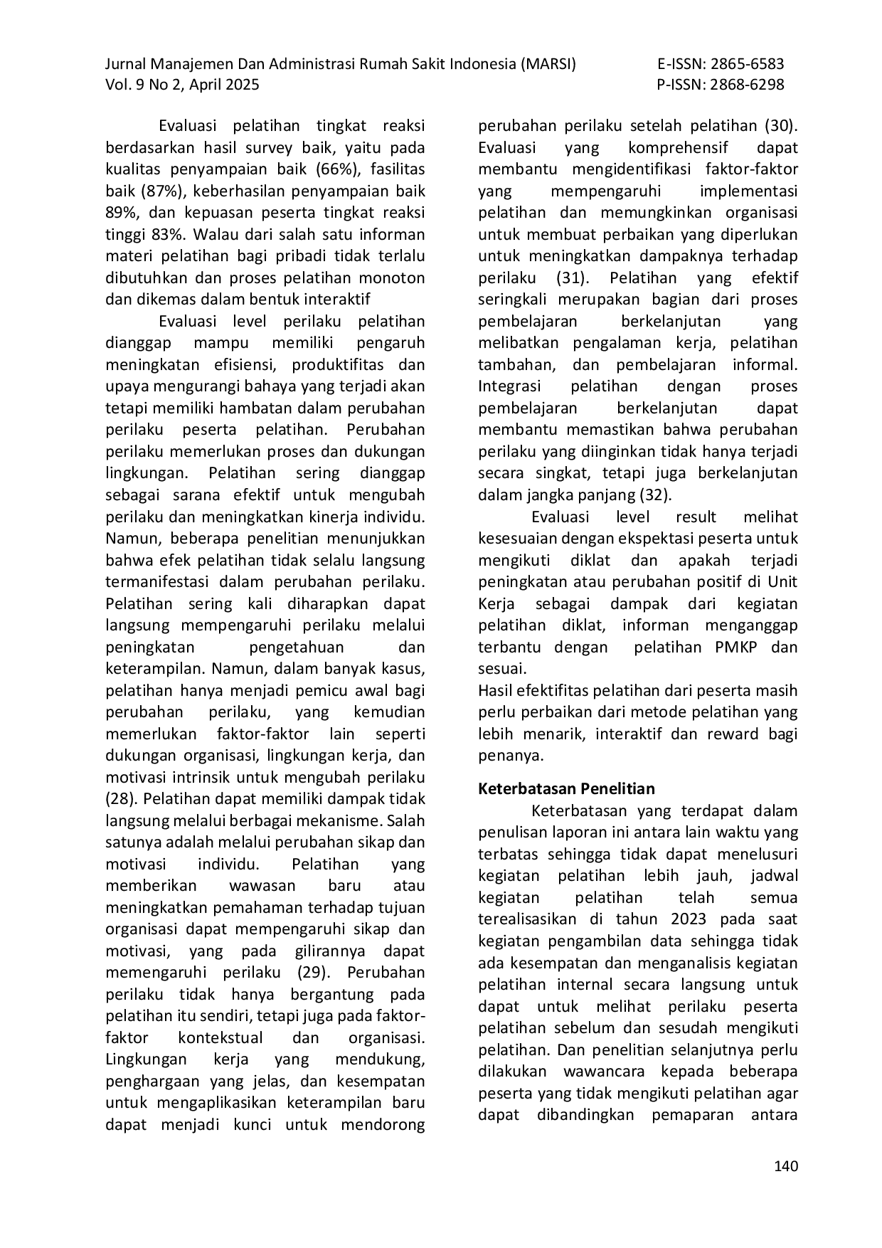 Jurnal Manajemen dan Administrasi Rumah Sakit Indonesia (MARSI)Jurnal Manajemen dan Administrasi Rumah Sakit Indonesia (MARSI)Pendidikan dan pelatihan (Diklat) merupakan proses pembelajaran untuk meningkatkan kompetensi dan kinerja tenaga rumah sakit. Evaluasi program diklat merupakan aspek krusial dalam pengembangan sumber daya manusia (SDM) di sektor kesehatan dan bagian integral dari upaya kontinu untuk meningkatkan kualitas pelayanan kesehatan serta memiliki peran penting dalam memastikan efektivitas, efisiensi, dan relevansi dari program serta membantu dalam memastikan tenaga kesehatan memiliki pengetahuan, keterampilan, dan sikap yang sesuai dengan standar yang ditetapkan, juga berkontribusi pada peningkatan keselamatan pasien. Tujuan penelitian ini adalah menelaah secara empiris mengenai evaluasi pelatihan budaya peningkatan mutu & keselamatan pasien (PMKP) & budaya 5R di RS Universitas Indonesia yaitu mengetahui gambaran evaluasi pelatihan pada tingkat reaksi, pembelajaran, perilaku dan hasil. Metode yang digunakan model evaluasi Kirkpatrick dengan jenis penelitian mix (kuantitif‑kualitatif) di Instalasi Diklat periode 11 Desember 2023 – 10 Januari 2024. Analisis evaluasi tingkat reaksi menggunakan data sekunder hasil survei RSUI mengevaluasi narasumber, fasilitas, keberhasilan pelatihan. Pengumpulan data dilakukan dengan cara observasi, wawancara mendalam dan telaah dokumen. Hasil yang didapatkan alur penyelenggaraan pelatihan RSUI sudah baik dengan kualitas penyampaian baik (66%), fasilitas baik (87%), keberhasilan penyampaian baik 89%, kepuasan peserta tingkat reaksi tinggi 83%, kehadiran peserta jauh dari target. Evaluasi tingkat pembelajaran baik dengan lulus post test 97%.