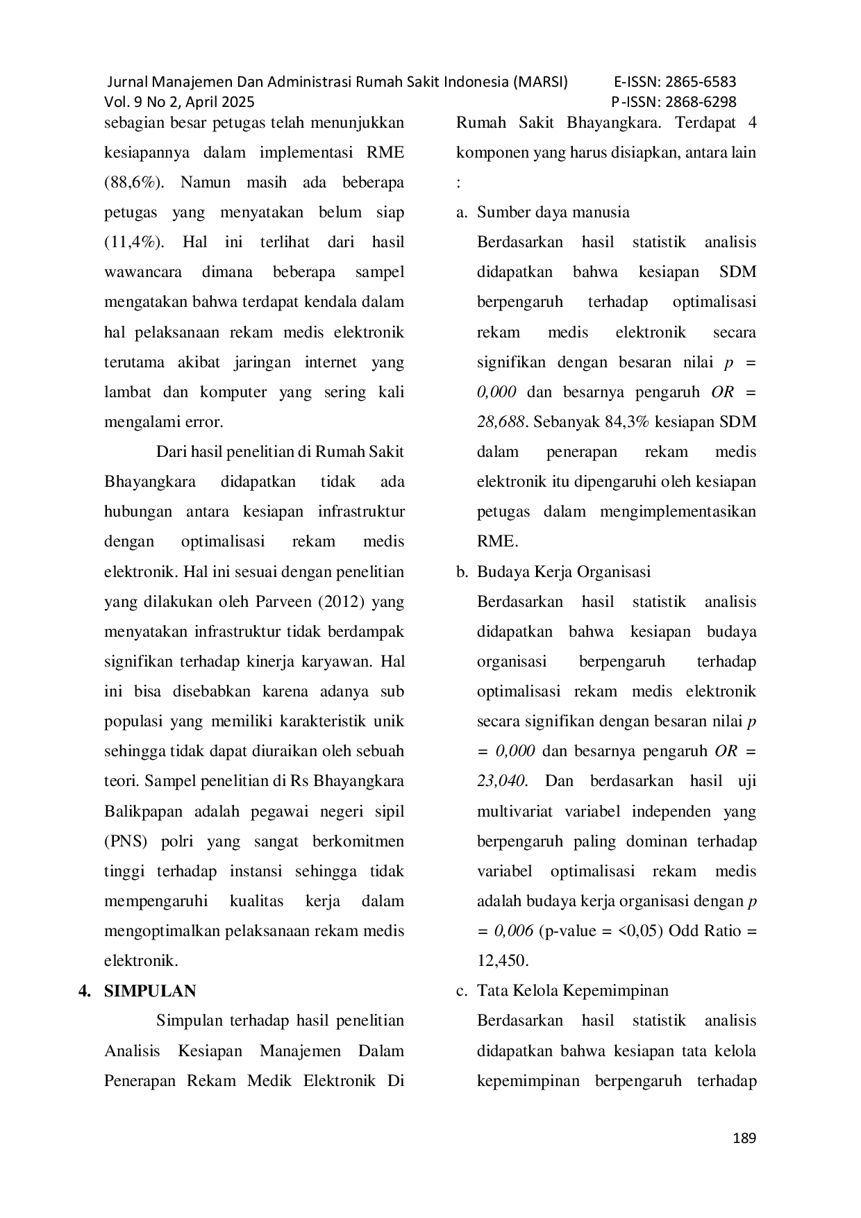 Jurnal Manajemen dan Administrasi Rumah Sakit Indonesia (MARSI)Jurnal Manajemen dan Administrasi Rumah Sakit Indonesia (MARSI)Implementasi Rekam Medis Elektronik (RME) terbukti efisien dan hemat biaya dalam meningkatkan kualitas pelayanan kesehatan dan meningkatkan aksesibilitas catatan kesehatan, serta kualitas dan ketepatan informasi pasien. Belum optimalnya RME di RS Bhayangkara dikarenakan belum adanya pelatihan dan sosialisasi terkait RME. Akibat permasalahan tersebut di atas, maka mengakibatkan berbagai masalah lainnya seperti semakin banyak jumlah dokumen retensi/inaktif. Penelitian ini bertujuan untuk mengetahui hubungan dari ke empat aspek tersebut serta faktor yang dominan yang berperan dalam optimalisasi rekam medis elektronik.