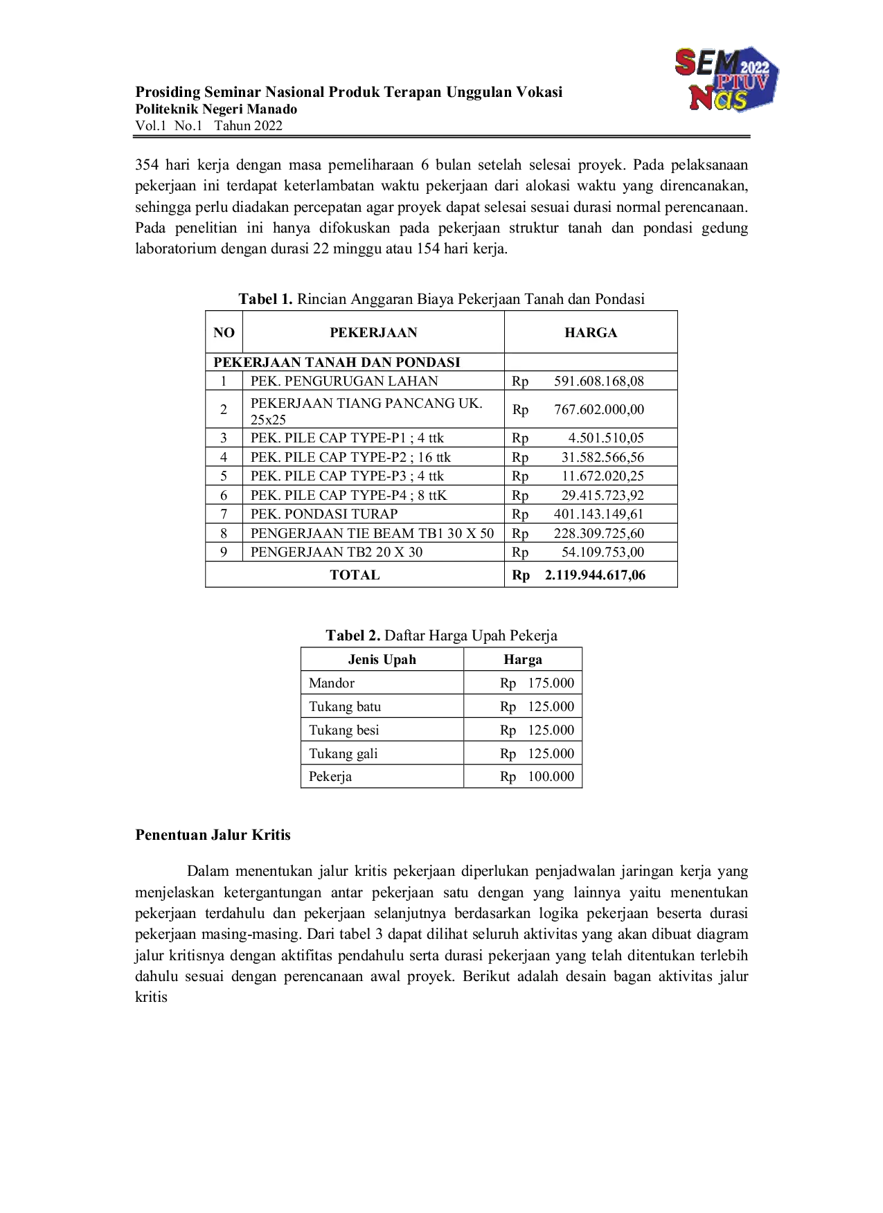 Prosiding Seminar Nasional Produk Terapan Unggulan VokasiProsiding Seminar Nasional Produk Terapan Unggulan VokasiPada masa pelaksanaan proyek konstruksi sering terjadi ketidaksesuaian antara jadwal rencana dan realisasi di lapangan yang dapat mengakibatkan pertambahan waktu pelaksanaan dan pembengkakan biaya pelaksanaan sehingga penyelesaian proyek menjadi terhambat. Maka dari itu diperlukan percepatan penyelesaian proyek, alternatif percepatan dapat berupa penambahan jam lembur, pengunaan alat yang produktif, penambahan jumlah pekerja, penggunaan material yang cepat pemasangannya dan metode konstruksi yang lebih cepat. Pelaksanaan yang mengalami keterlambatan perlu dilakukan percepatan. Analisis yang dilakukan pada penelitian ini dengan mempersingkat waktu pelaksanaan proyek dengan alternatif penambahan 3 jam kerja (lembur) pada kegiatan-kegiatan kritis yang didapat dari analisi jaringan kerja berupa CPM. Hasil yang didapatkan adalah durasi setelah percepatan yaitu 18 minggu atau 126 hari kerja atau lebih cepat 18,18% dari durasi normal yaitu 22 minggu atau 154 hari kerja, sedangkan biaya upah tenaga kerja setelah percepatan mengalami peningkatan dari biaya normal sebesar Rp. 47.750.000,00 menjadi Rp. 88.737.716,76.