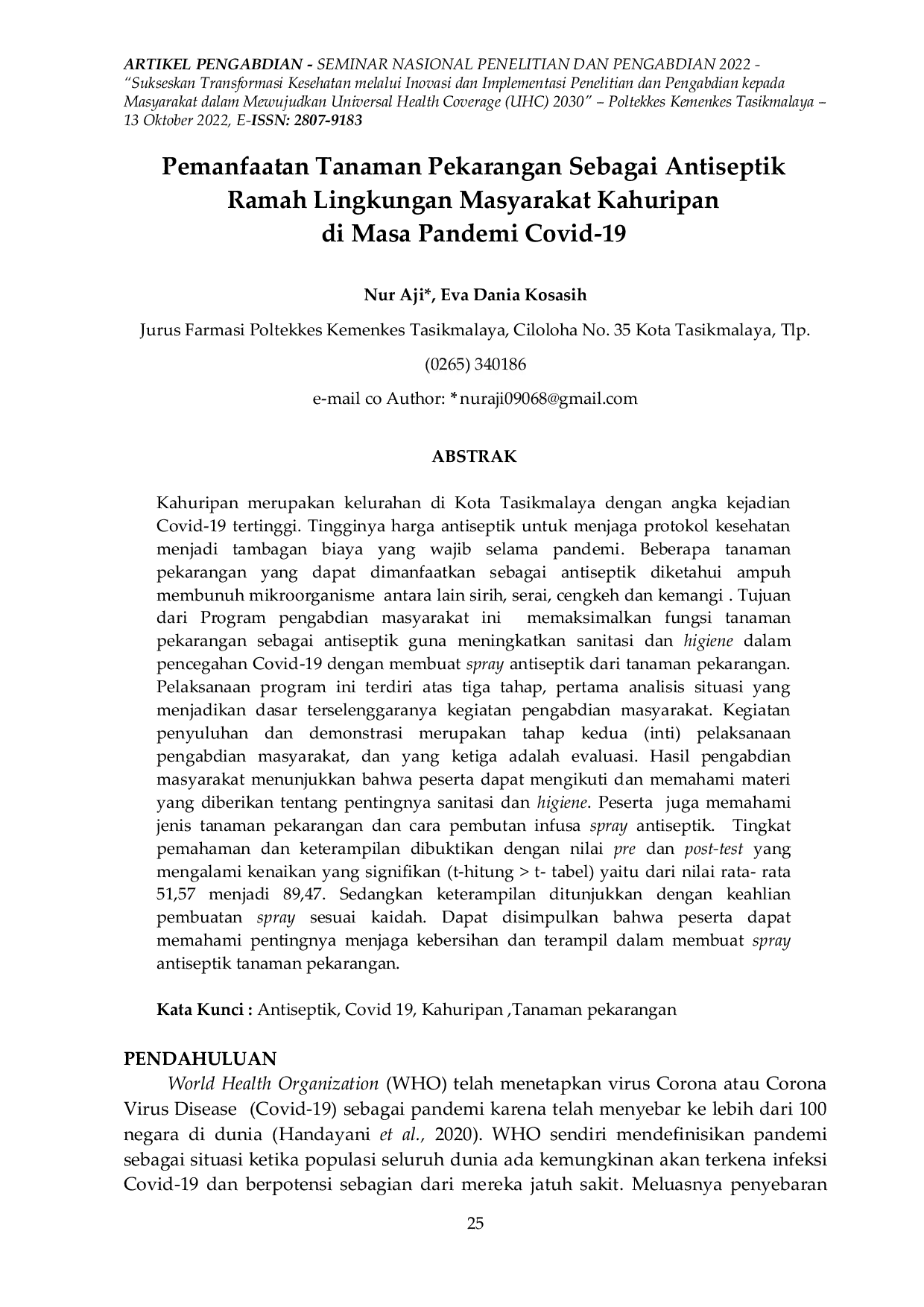 Prosiding Pengabdian Kepada Masyarakat Poltekkes Kemenkes TasikmalayaProsiding Pengabdian Kepada Masyarakat Poltekkes Kemenkes TasikmalayaKahuripan merupakan kelurahan di Kota Tasikmalaya dengan angka kejadian Covid-19 tertinggi. Tingginya harga antiseptik untuk menjaga protokol kesehatan menjadi tambahan biaya yang wajib selama pandemi. Beberapa tanaman pekarangan yang dapat dimanfaatkan sebagai antiseptik diketahui ampuh membunuh mikroorganisme antara lain sirih, serai, cengkeh dan kemangi. Tujuan dari Program pengabdian masyarakat ini memaksimalkan fungsi tanaman pekarangan sebagai antiseptik guna meningkatkan sanitasi dan higiene dalam pencegahan Covid-19 dengan membuat spray antiseptik dari tanaman pekarangan. Pelaksanaan program ini terdiri atas tiga tahap, pertama analisis situasi yang menjadikan dasar terselenggaranya kegiatan pengabdian masyarakat. Kegiatan (inti) pelaksanaan penyuluhan dan demonstrasi merupakan pengabdian masyarakat, dan yang ketiga adalah evaluasi. Hasil pengabdian masyarakat menunjukkan bahwa peserta dapat mengikuti dan memahami materi yang diberikan tentang pentingnya sanitasi dan higiene. Peserta juga memahami jenis tanaman pekarangan dan cara pembutan infusa spray antiseptik. Tingkat pemahaman dan keterampilan dibuktikan dengan nilai pre dan post-test yang mengalami kenaikan yang signifikan (t-hitung > t- tabel) yaitu dari nilai rata- rata 51,57 menjadi 89,47. Sedangkan keterampilan ditunjukkan dengan keahlian pembuatan spray sesuai kaidah.