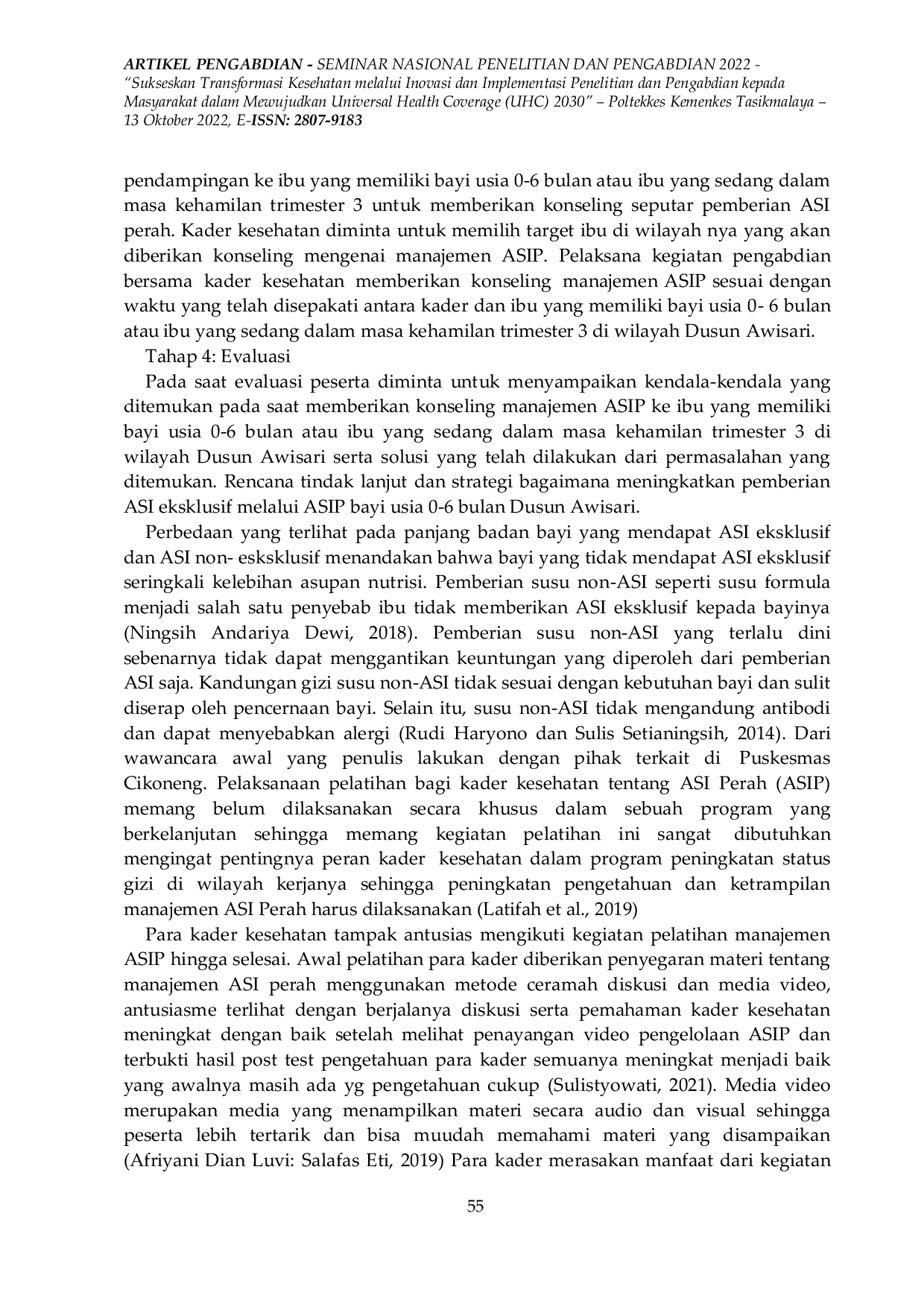 Prosiding Pengabdian Kepada Masyarakat Poltekkes Kemenkes TasikmalayaProsiding Pengabdian Kepada Masyarakat Poltekkes Kemenkes TasikmalayaPemberian ASI perah (ASIP) merupakan salah satu upaya pendukung untuk mensukseskan pemberian ASI eksklusif. Kurangnya pengetahuan ibu tentang pemberian ASI perah memerlukan dukungan dari berbagai pihak, baik keluarga maupun lingkungan sekitar. Peran kader kesehatan dapat membantu meningkatkan upaya pemberian ASI eksklusif melalui pemberian ASI Perah (ASIP) sehingga ibu menyusui tidak perlu menggantikan ASI dengan susu formula saat ada kegiatan diluar rumah maupun bekerja. Peningkatan ketrampilan kader dalam manajmen ASI perah dapat dilakukan dengan kegiatan pelatihan sehingga kader dapat melanjutkan informasi tentang manajemen ASIP kepada ibu menyusui di lingkungan masyarakat Dusun Awisari. Pelatihan diberikan dengan metode ceramah, diskusi kemudian demontrasi pengelolaan ASIP. Hasil yang diperoleh dari pelatihan ini adalah peningkatan pemahaman dan ketrampilan pengelolaan ASIP serta kader kesehatan bisa melakukan penyuluhan dan pengelolaan ASIP bagi ibu di Dusun Awisari.